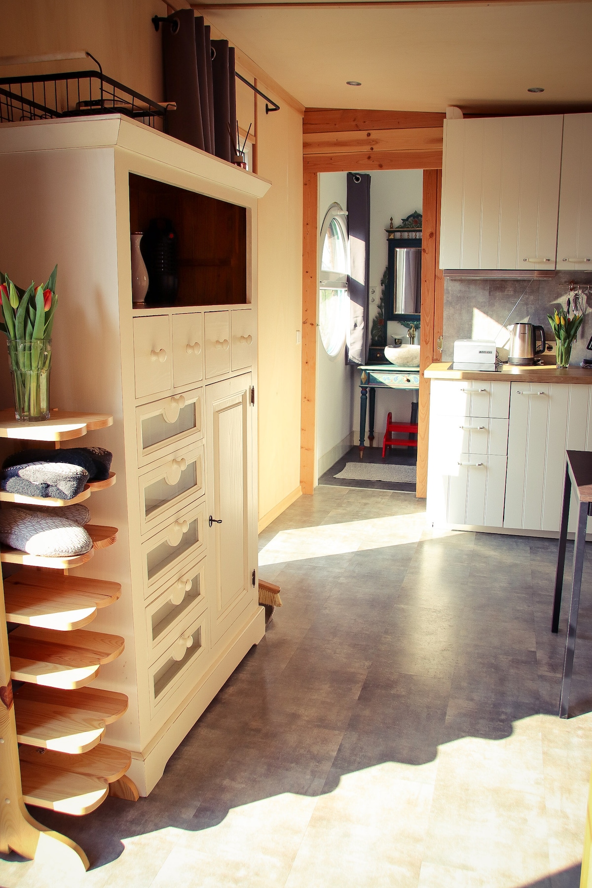 NEW: Right next to "Mono" is another house, "Nest in the Forest." You can also visit. Or both… “Mono” is a trailer that was converted decades ago. In the course of a complete renovation, it received a timber frame skeleton all around in 2020 (new roof, new insulation, etc.) and thus a first floor. Size: 3.20 by 13 meters. It is called "Mono" because its exterior, like every room inside, is mainly determined by one color.