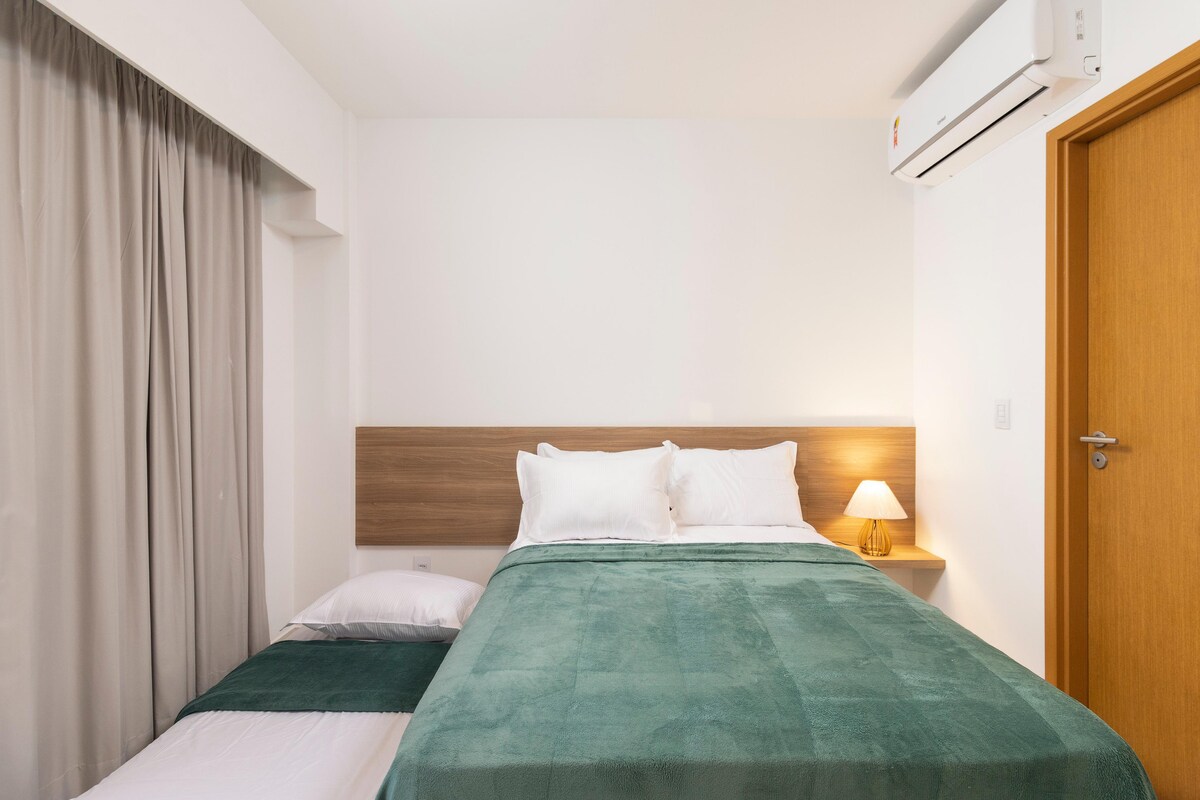 Studio at Marulhos Suites Resort. Queen bed, double bed, extra mattress, air-conditioning, good internet and smart TV. The kitchen has a refrigerator, freezer, coffee maker, sandwich maker and other kitchen utensils. Cozy apartment facing the pools. The hotel is first-rate, featuring multiple swimming pools, a sauna, fitness center, soccer and tennis courts, playground and daily recreation for the kids. I've been renting this and other flats in Muro Alto for a few years, so you can trust me!