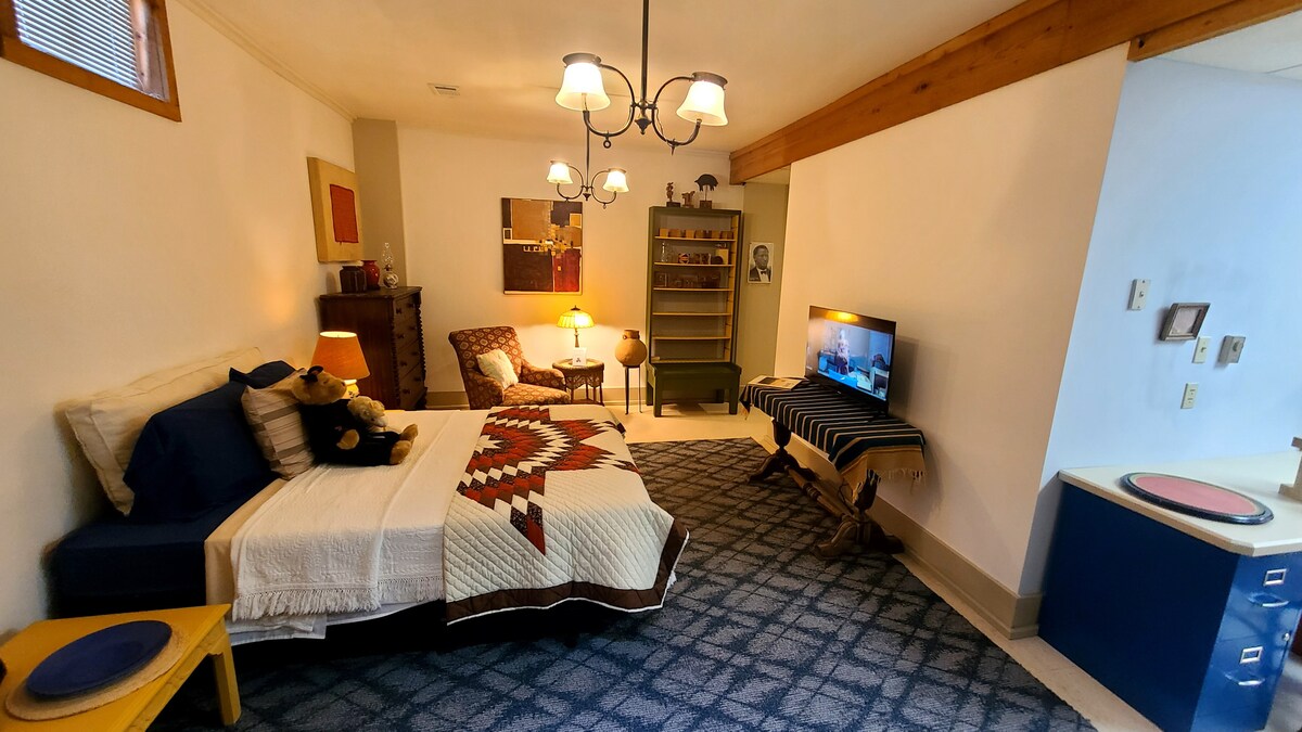 This large efficiency apartment offers a comfortable living space, fully furnished and recently refurbished with fresh paint throughout. It includes a separate downstairs entry room, providing added privacy and convenience. The kitchen is enhanced by a charming bay window, creating a bright and inviting atmosphere. Perfect for those seeking a stylish and functional living space! Included are utilities, Internet,Take it easy at this unique and tranquil getaway.