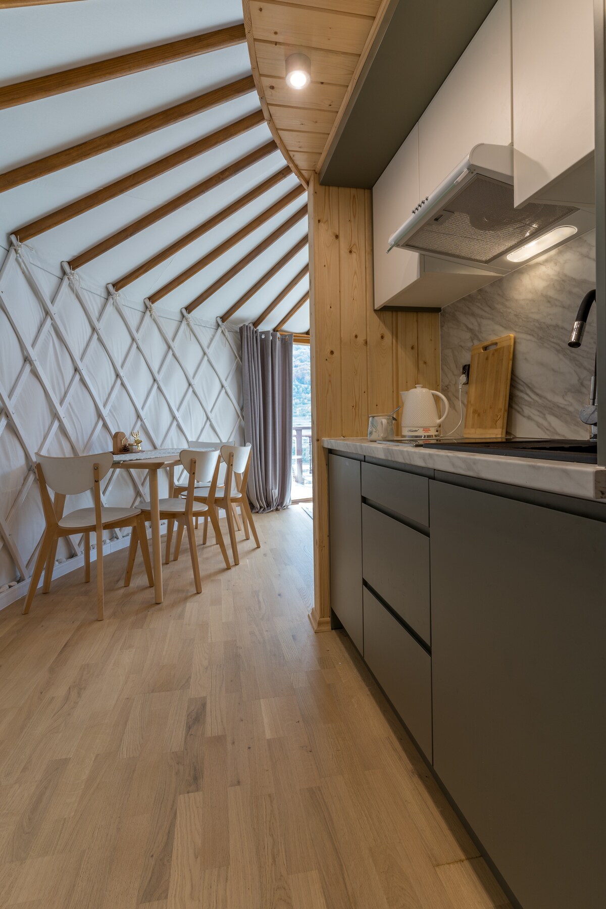 Luksusowy Glamping w Beskidzie Niskim Przestronna i wygodna, w pełni wyposażona jurta z dużym łóżkiem małżeńskim, eleganckim wnętrzem, w pełni wyposażoną łazienką i aneksem kuchennym. Własne miejsce na ogniska, jacuzzi na tarasie (dodatkowo płatne) oraz wygodne leżaki. AZYL GLAMP jest idealnym miejscem na romantyczny wyjazd, zaręczyny czy rocznice. Potrzebujesz miejsca do pracy? Daj mi znać a umieszczę dla Ciebie dodatkowo biurko regulowane, fotel i monitor (rezerwacje minimum 5 dni)