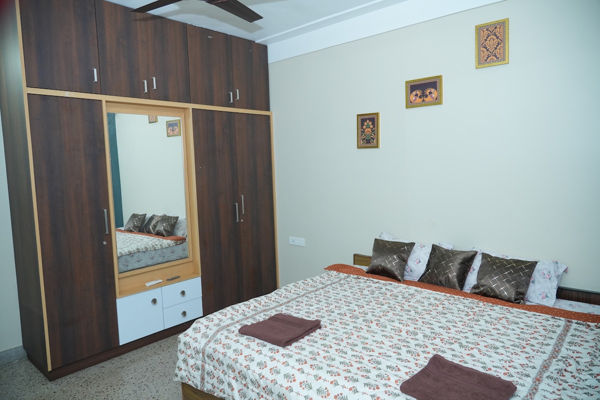 A newly renovated 2 BHK with A/C, tasteful furniture, lighting, brand new amenities @ heart of the city, a peaceful, residential location. We aspire to provide friendly, clean, affordable stay. Hall : Sofa, Diwan, 43" LED TV, DTH, Wifi Dining : 4 seat table cum workspace Bedroom (2) : 2 Queen size beds, 2 floor mattress , A/C, Window cradle hanger Kitchen : Fridge, Induction stove, Basic utensils Bathroom (2) : Liq soap, Geyser, Western toilets Utility : Washing m/c, UPS, Cloth drying stand