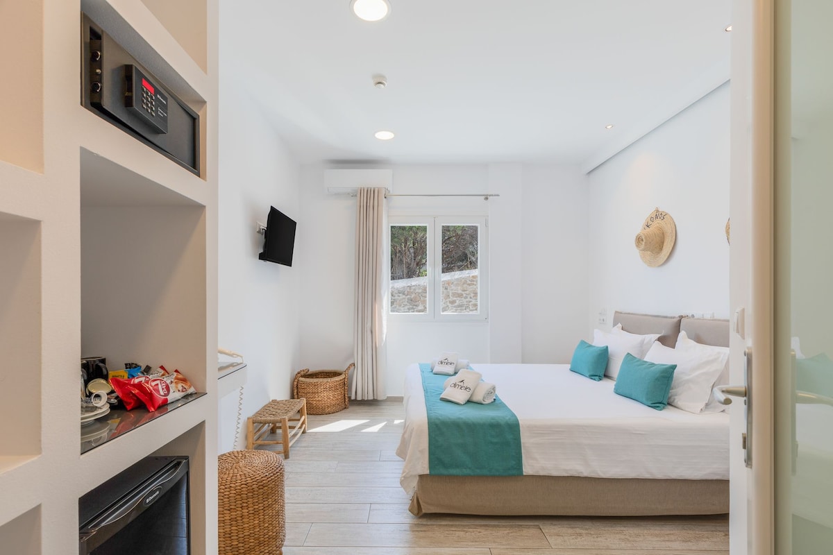 Its ideal for couples, for friends and business travelers. Deluxe Private Room has the option of a double or two singles beds, air condition Wi fi , mini refrigerator, tv, hair dryer, safe box, kettle and coffee and tea amenities.. The room has window facing the main road.There isnt a private balcony through the room but you can enjoy the beautiful sunset ,the famous windmills and the breathtaking chucrh of Saint Charalampos from the common balcony
