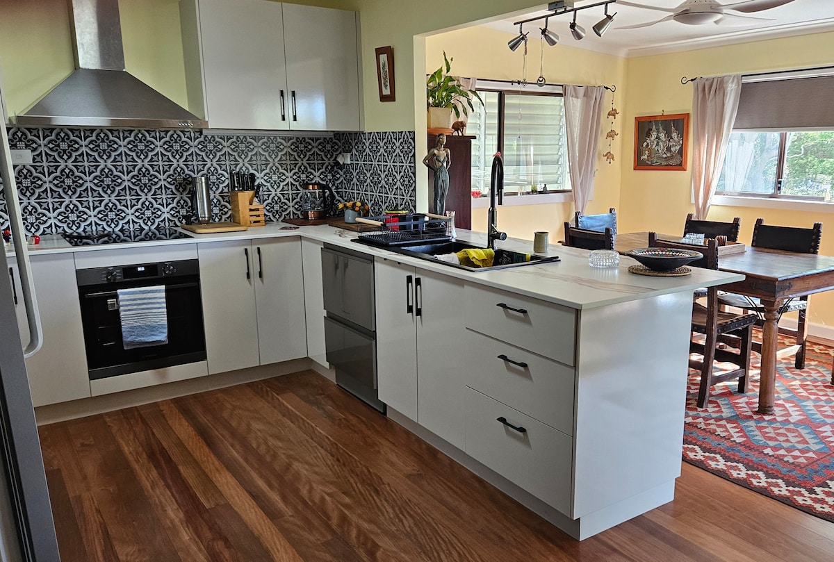 Your suite is located at the rear of our home in a quiet semi-rural area - less than 5 minutes from supermarkets, food outlets, and coffee shops. We are approximately 40 minutes from the nearest beach and national parks. The space has a queen bed, ensuite, dining/lounge area and kitchenette. Generous breakfast provisions. Discounted longer stays. A bbq is available on the deck. We have a small dog and a cat. The room has a private entrance. Undercover parking and washing machine on request