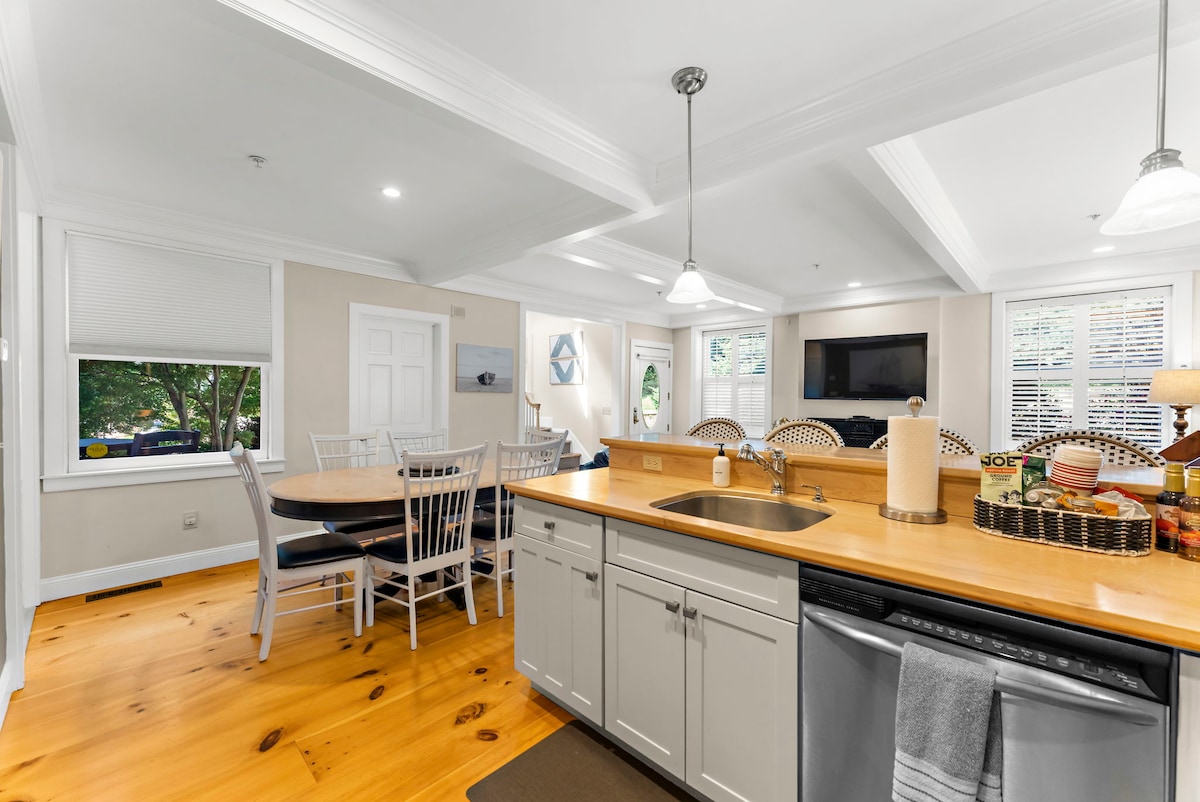 Enjoy a short walk to the shops and restaurants in historic downtown Mystic from this immaculate three bedroom, two full-bath home. With room for 8 guests this nautically-themed home is perfect for families, groups in town for business or a get-away, or guests in town for a wedding. The master suite features a king-sized bed and private bath with tiled shower. The second bedroom has a queen bed, and the third bedroom has two full beds. Fully renovated kitchen. (Strict 4-car parking limit)