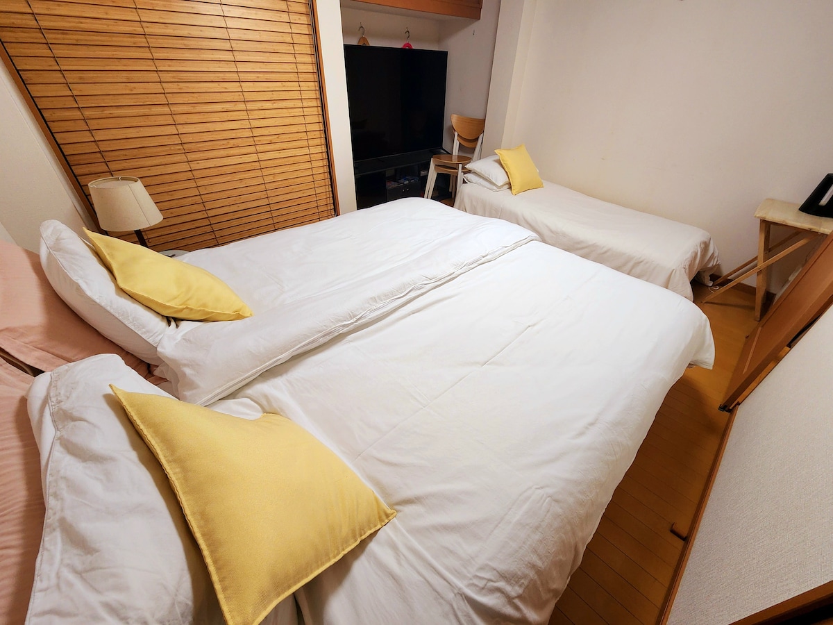 Thanks for looking. It is about a 10-15 minute walk from Sannomiya Station. 65-inch large screen TV. You can watch YouTube, Netflix, etc. from the menu button. It can accommodate up to 3 people because it has two single beds, futons, and tatami futons. Two single beds are joined together, It is a large bed with a width of 200 cm and a length of 200 cm. Single futons are provided for each person. Futon covers, duvet covers, pillow covers, bed sheets, all covers are changed. We provide one bath towel and one face towel, but please let us know in advance if you need more. There are many delicious and cozy restaurants nearby. Coffee and breakfast from nearby coffee shops can be delivered. Free parking 1 vehicle We operate several spaces, so it is not available when other guests are parked. Please check with me in advanced.