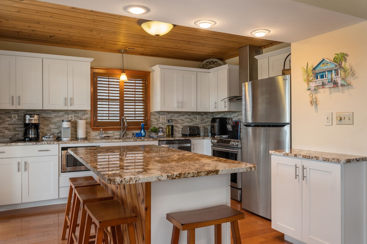 This charming cottage located steps from the ocean is loaded with character, originally built to be a diner in 1948 it has been renovated into a charming rental for you to enjoy! This small cottage is 810 sqft, 1 king bedroom and 2 xl twins in bunkroom, 1 queen sofa bed in the sunroom, 1 bath, with an open living, dining, kitchen area. The porch is a favorite spot for morning coffee or evening happy hours!