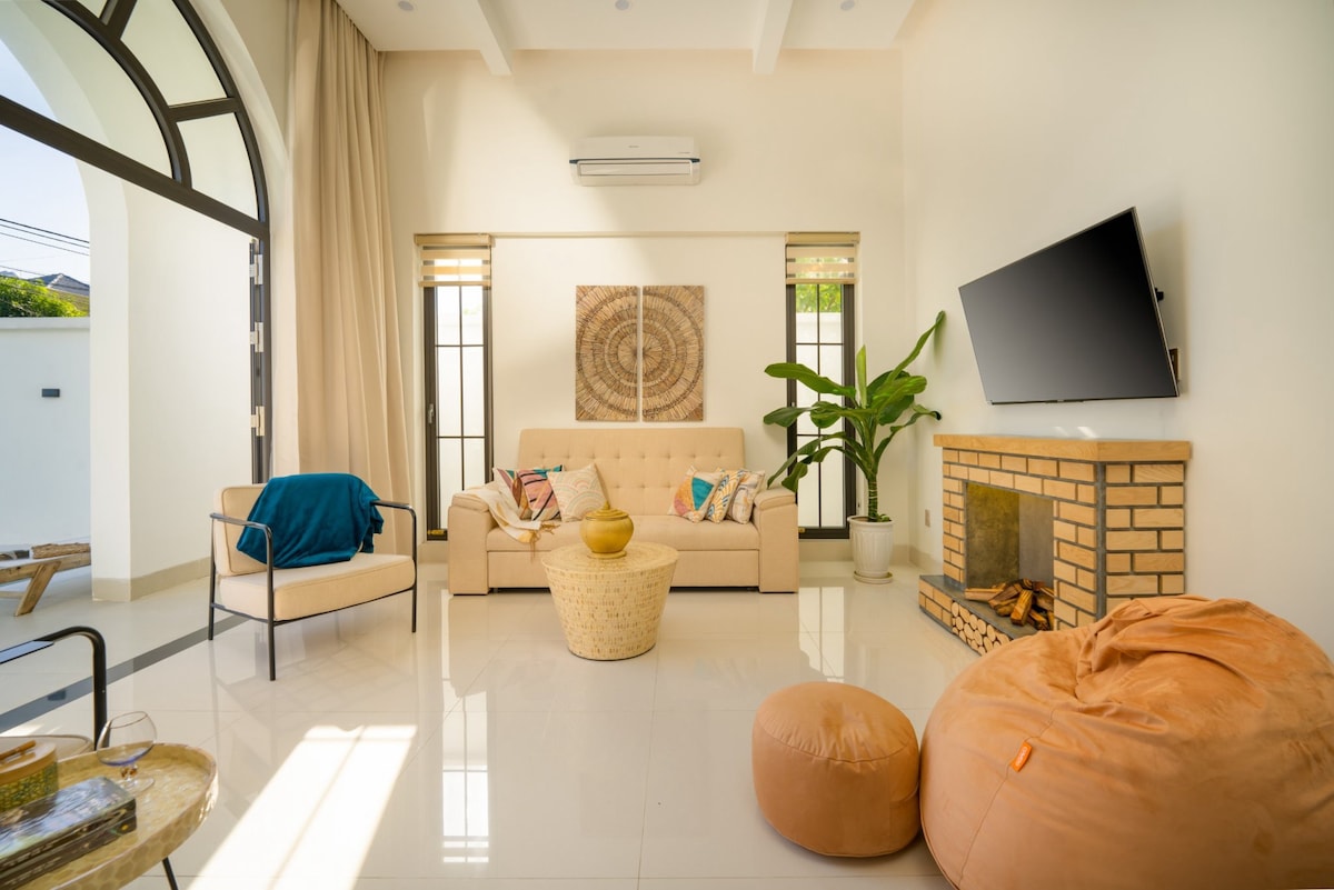 ❤️ WELCOME TO FEN MINI❤️ 🛏️ 1 BEDROOMS – 1 BEDS – 1 BATHROOMS ❄️ FullL A/C 🍽️ SPACIOUS LIVING ROOM AND KITCHEN 🏊♂️ PRIVATE COOL POOL WITH 6 MASSAGE SEATS 💧 CLEAN WATER SYSTEM ENSURING YOUR HEALTH 🔥 FREE BBQ CHARCOAL 2KG ❤️ Our modern and cozy style is perfect for a group of friends, colleagues, or family looking for a relaxing getaway 🏖️ Man Thai Beach 5-minute walk away