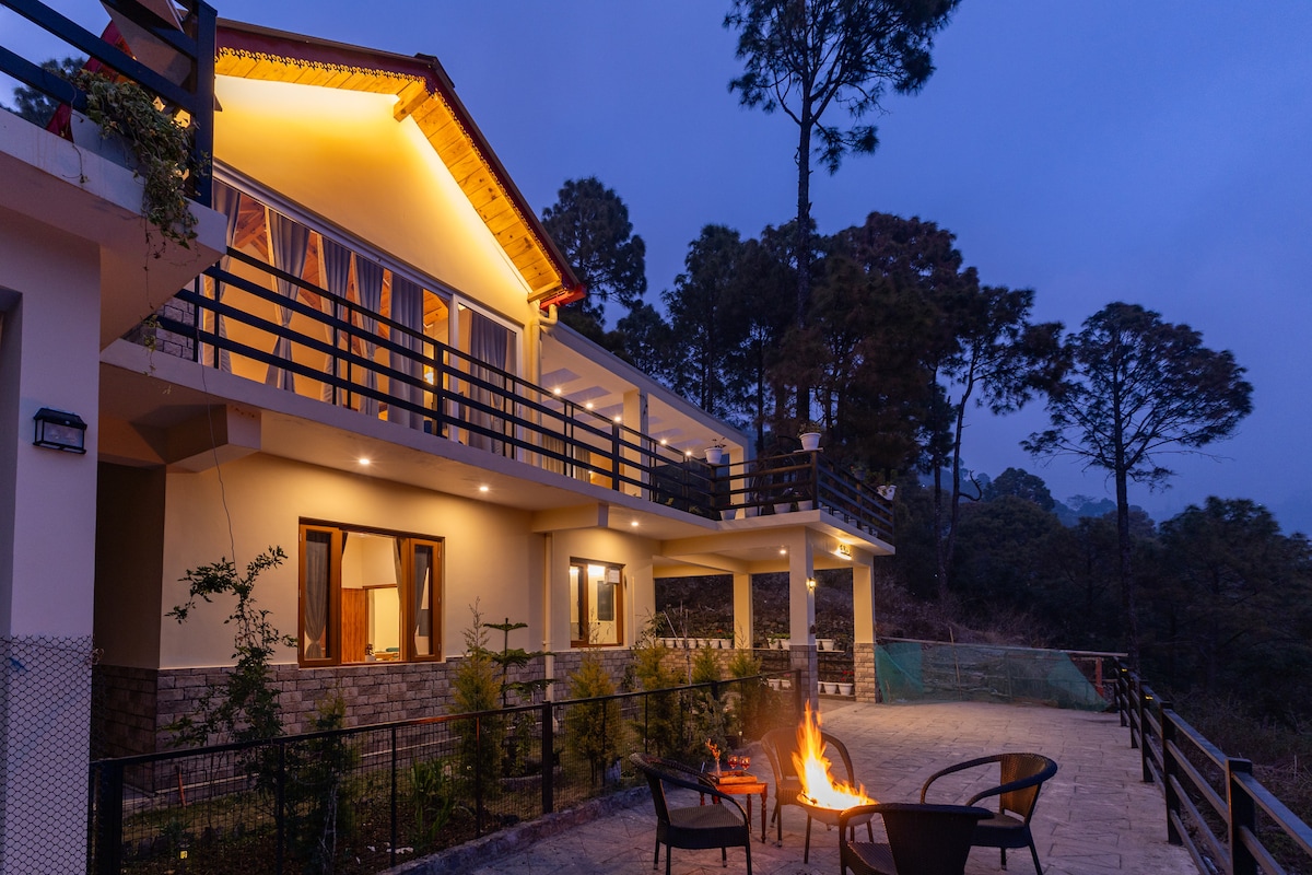 This serene 3BHK villa is situated in a gated community between Bhimtal and Nainital. The villa is located within 30 minutes of major attractions such as Kainchi Dham, Nainital Lake, Bhimtal Lake, and Sattal Lake. The property features a back garden, a glass-covered living area on the first floor, and a rustic living area on the ground floor, providing a perfect blend of comfort and charm.