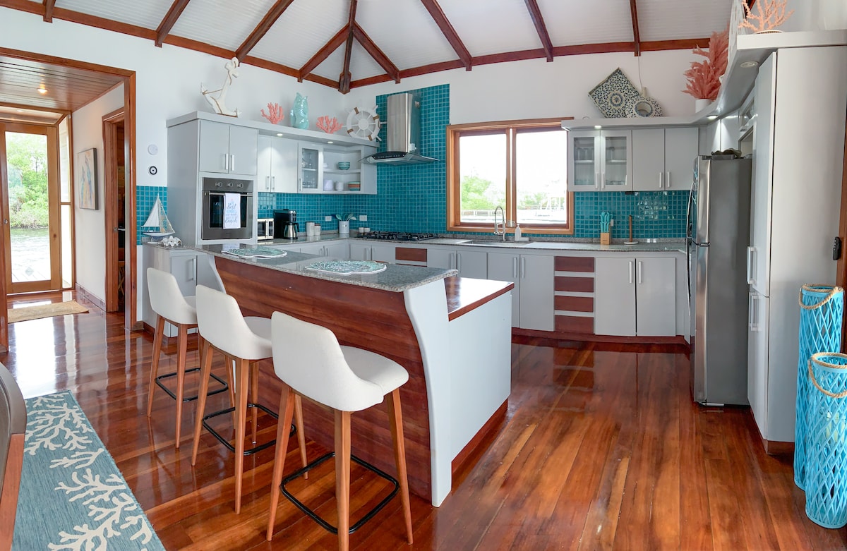 Beautiful Eco Beach House with luxury touches! Relax on your spacious private deck overlooking the coral reef. Snorkel right off the dock or hop into the warm water from your beachfront cabana. Be mesmerized by the vivid overwater sunsets in front, coconut grove on either side, and lush rainforest behind. Fall asleep to the tranquil sound of waves lapping below. Wake refreshed with coconut water from your own coconut grove. Our team looks forward to welcoming you! -GoGo, Mili, Mikel, Eimy, Baby