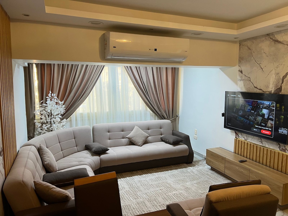 : ✨ Stylish 3-BR apartment in Cairo’s Golf area – steps from City Stars & top restaurants! Modern apartment with a master bedroom (king bed & TV), two twin bedrooms, elegant bathroom, cozy living room with smart TV, dining for 6, and fully equipped kitchen. Safe and lively neighborhood, perfect for families or groups.