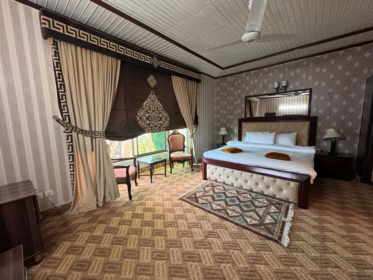 This Executive Room at Hotel Hilla offers a comfortable stay in the peaceful surroundings of Nathia Gali. The room accommodates up to 3 guests and includes one king-size bed and one sofa bed. Each room has a private attached full bathroom with hot water, fresh linens, towels, and essential guest amenities. Guests can access the hotel lobby, on-site restaurant, café, outdoor sitting area, and parking. Heating is available for cooler weather, with staff assistance throughout the stay.