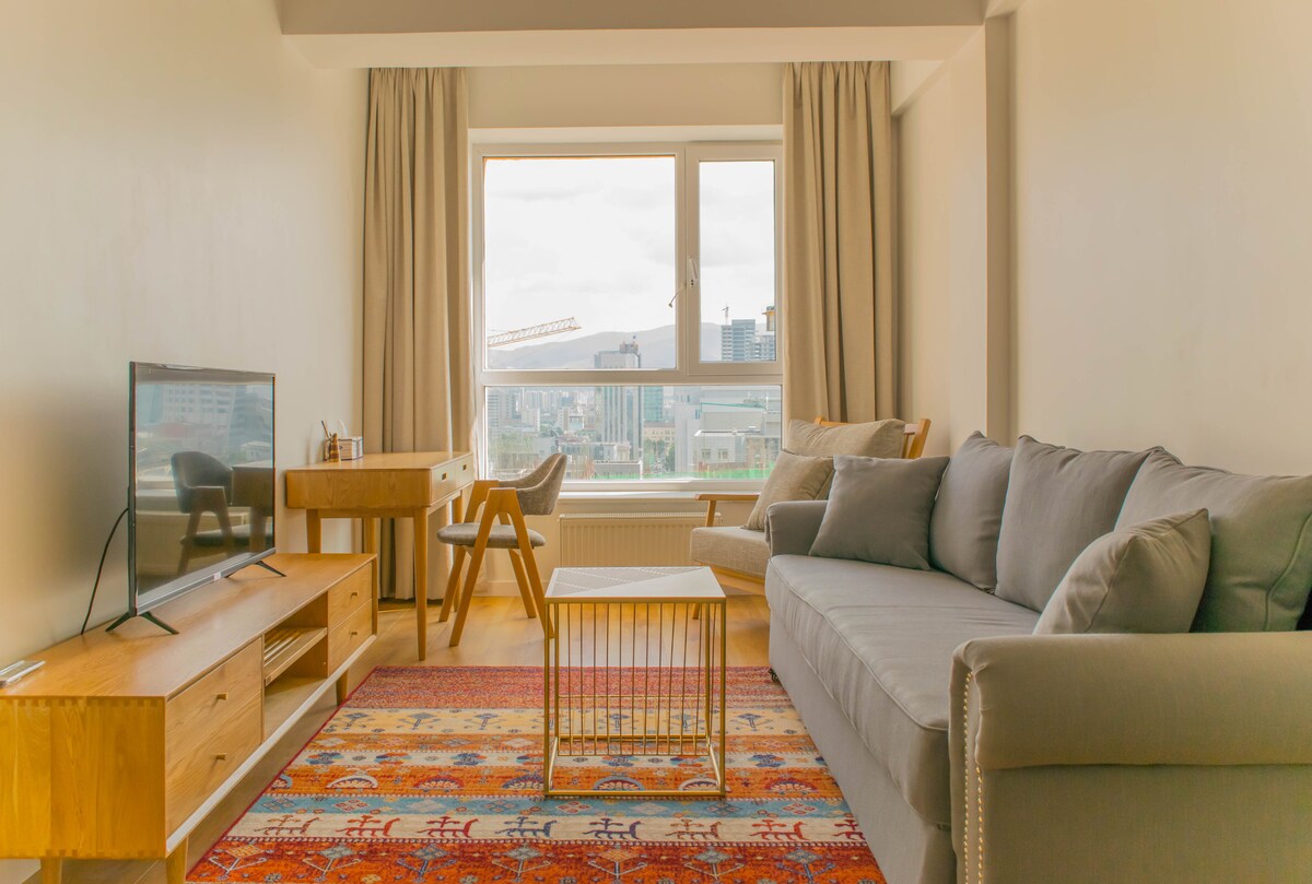 - Stay in the heart of UB. Walk to nearly all major attractions, shops, and restaurants. - Just 5 minutes from the Chingis Khan Museum and 13 minutes from Sukhbaatar Square and the Parliament building. · Sunny, peaceful 1-bedroom apartment filled with plants · King-size bed, fast Wi-Fi & cable TV · Fully equipped kitchen+cozy coffee station 🪴 Breathe easy in this fresh, green oasis. Looking forward to hosting you! Lulu
