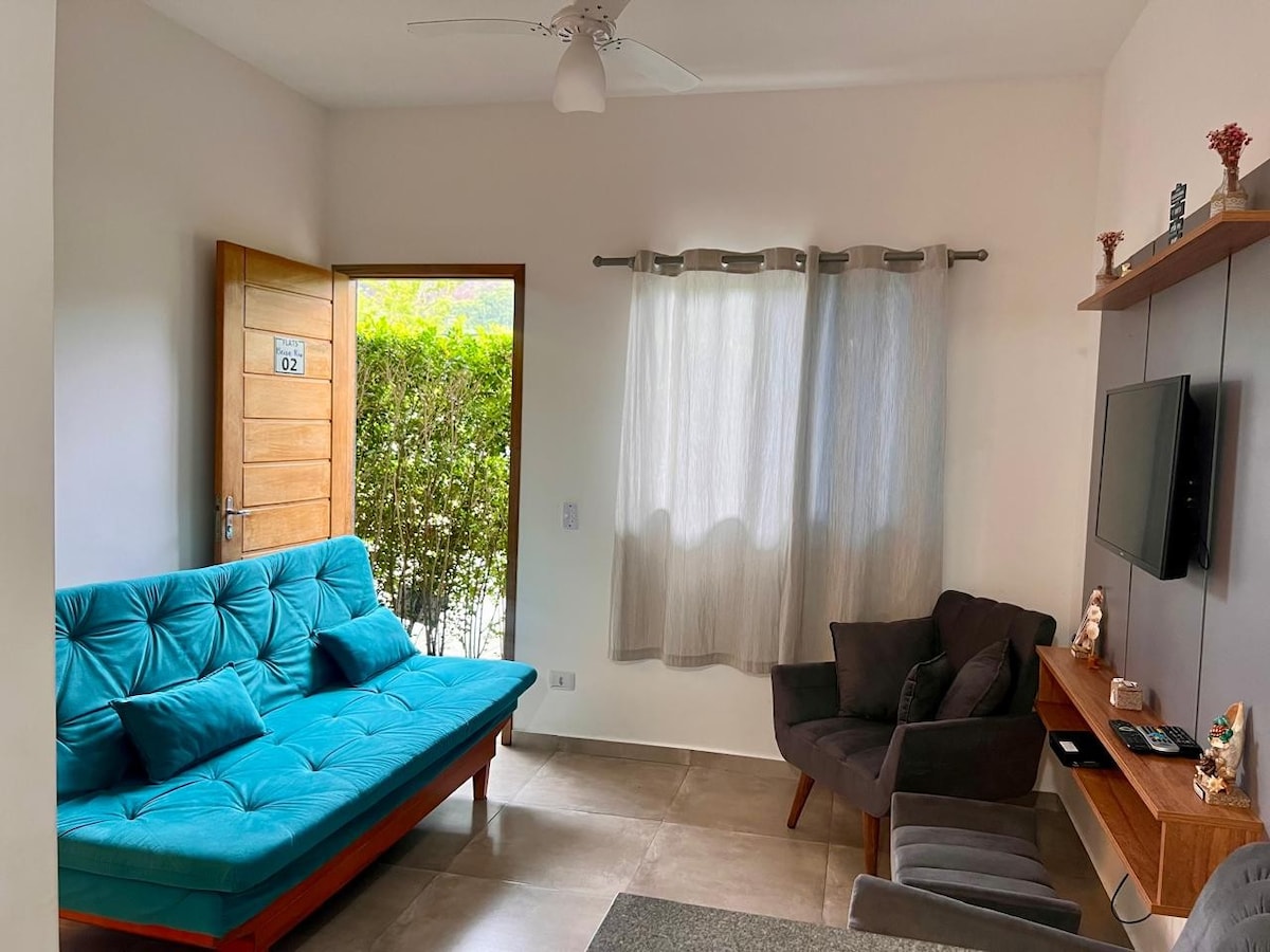 Beautiful apartment at Lagoinha Beach - Ubatuba! The condominium offers a privileged ocean view. With space to accommodate up to 4 people, the apartment features a cozy bedroom with a comfortable double bed, a single trundle bed, and a sofa bed in the living room. Kitchen equipped with everything you need to prepare your meals, stove, refrigerator, microwave, grill, and kitchen utensils. The building has an outdoor pool and two barbecue areas. Follow us on IG @ap_san_junipero