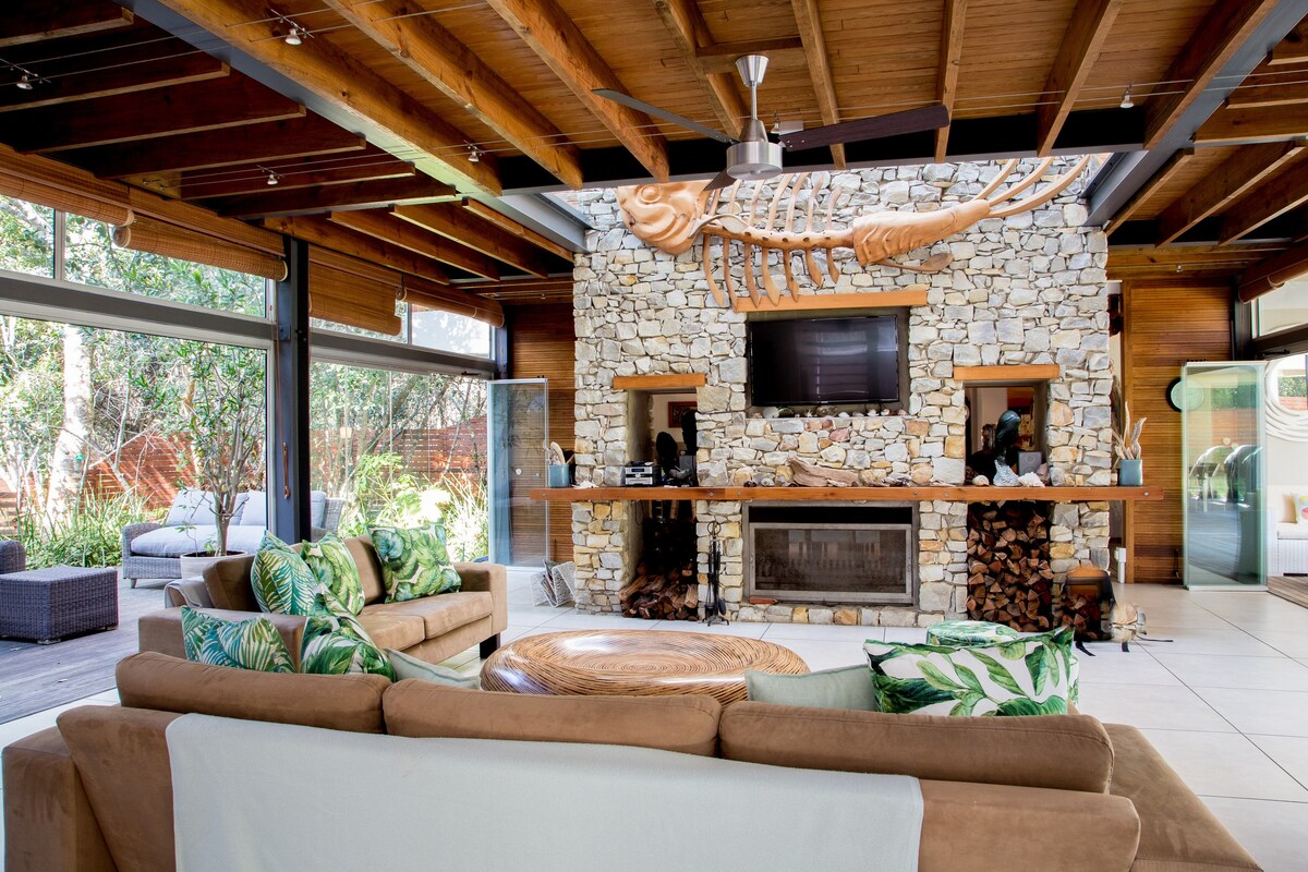 "Bird Song" is named after the host of bird calls that greet you each morning (and the night jars that you hear after dark). It is the perfect 'private bush camp' for a ‘family-of-4’ vacation or for a secluded ‘get-away-from-it-all retreat’ for couples. The architect designed timber structure is set on a slope with views through and over the fynbos and right at the edge of pristine Indigenous Forest. A wood fired fireplace ensures you are (relatively) warm in winter.