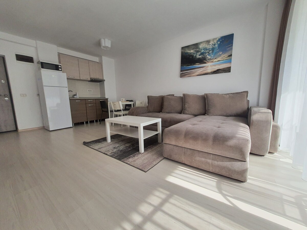 Modern Apartment with Sea View – Alezzi Beach Resort, Mamaia Nord Enjoy your stay in this stylish and fully equipped apartment, located in the exclusive Alezzi Beach Resort, just 1 minute away from the beach and popular beach bars like Nuba, Fratelli, and Breeze.