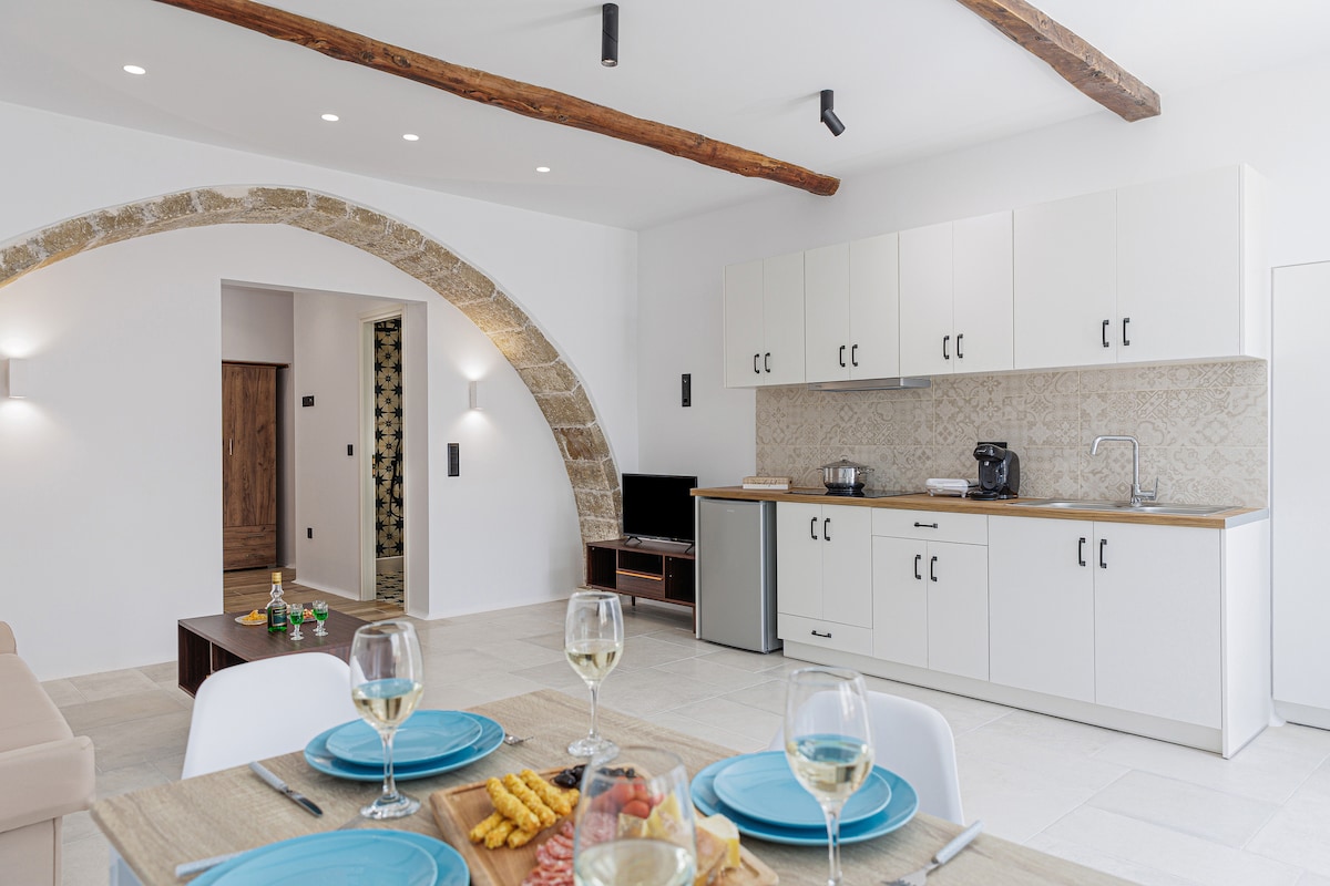 A spacious studio with sea views and a private hot tub, just steps from the beach. Flat Poseidon, part of Enosis Apartments, is located at Agia Anna of Naxos, steps from the long sandy beach and the crystal clear blue waters. The studio offers a generous interior layout and a private balcony with a sea view and a private hot tub, combining comfort and outdoor living. Designed in traditional Cycladic style, it is an ideal choice for guests who value space, privacy, and easy access to the beach.