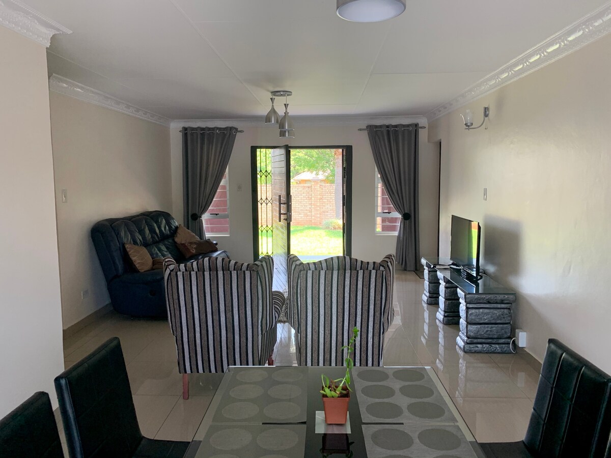 This charming two-bedroom, one-bathroom unit, located in a safe secure neighbourhood, accommodate six guests comfortably. Both bedrooms offer plush queen-sized beds. The living area doubles as an additional sleeping space, with a sofa bed for extra guests. A modern bathroom offers all the essentials for your stay. Open-plan kitchen, fully equipped and adjoining dining area. Relax in the cozy living room or step out to enjoy the patio and swimming pool. Enjoy free wifi and no load shedding