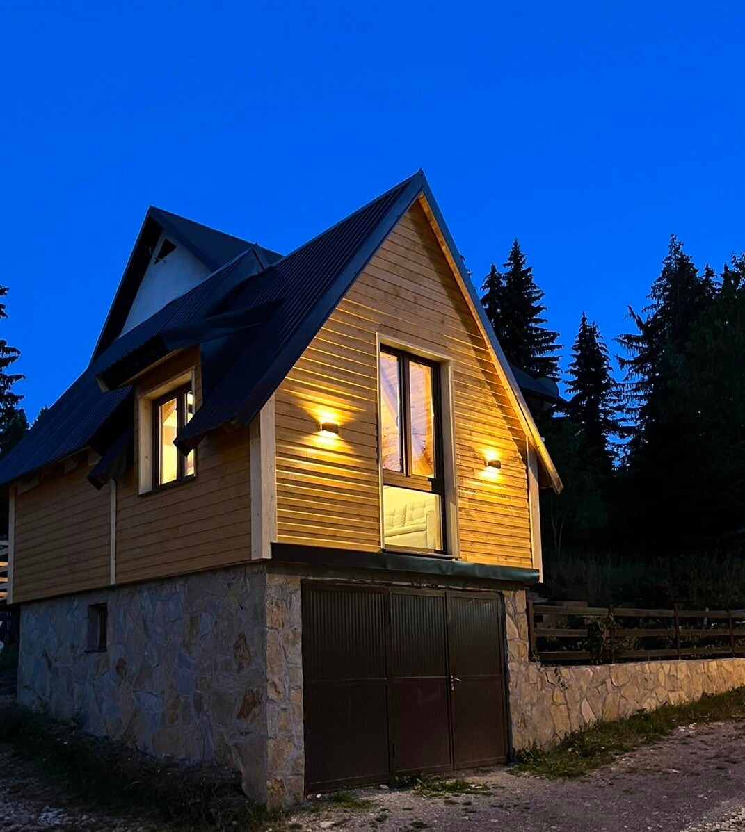 Nestled in pristine nature, this charming, stylishly decorated cottage offers an incredible view of Durmitor Mountain and Riblje Lake. The front is entirely made of glass, providing an unforgettable panoramic experience. Stunning lighting enhances its remarkable appearance. Upstairs, the gallery features a cozy French bed, perfectly positioned to wake up to the breathtaking sight of the mountain. This cottage is the ideal retreat for complete enjoyment of natural beauty and tranquility.