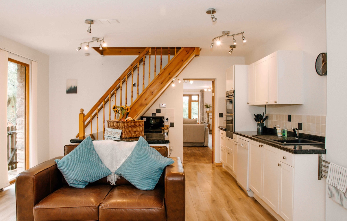 Ground floor sitting room , kitchen dining area, a log burning stove to relax by the fire,use in Winter only. Kitchen - bespoke cabinets, a granite worktop with electric Aga. An open plan style living/dining room bespoke dining table. Oak staircase to the first floor landing, master bedroom with king size bed, velvet padded headboard , a large round window has incredible views, true luxury. A seperate contemporary bathroom room, with a shower over bath, washbasin, wc and a heated towel rail.