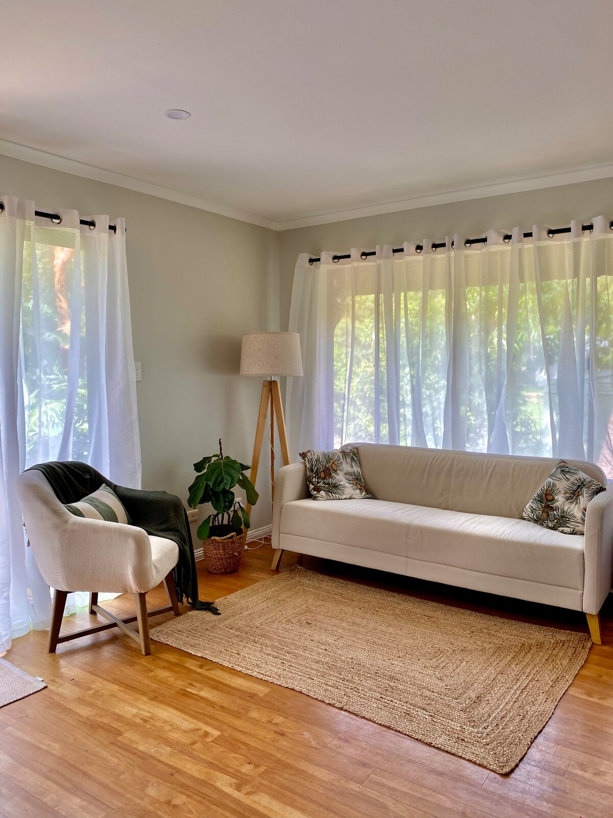 Relax in your own private sanctuary with queen bedroom, bathroom with freestanding bath and shower, a separate study/ studio with work area, and a kitchenette and laundry. Lounge in comfort in the spacious living room opening onto a large sunny deck overlooking the luscious native garden. Everything is provided for your comfort, including a light continental breakfast, coffee, tea and snacks, fluffy robes and top quality bedding, sheets and towels. Beach chairs and towels also provided.
