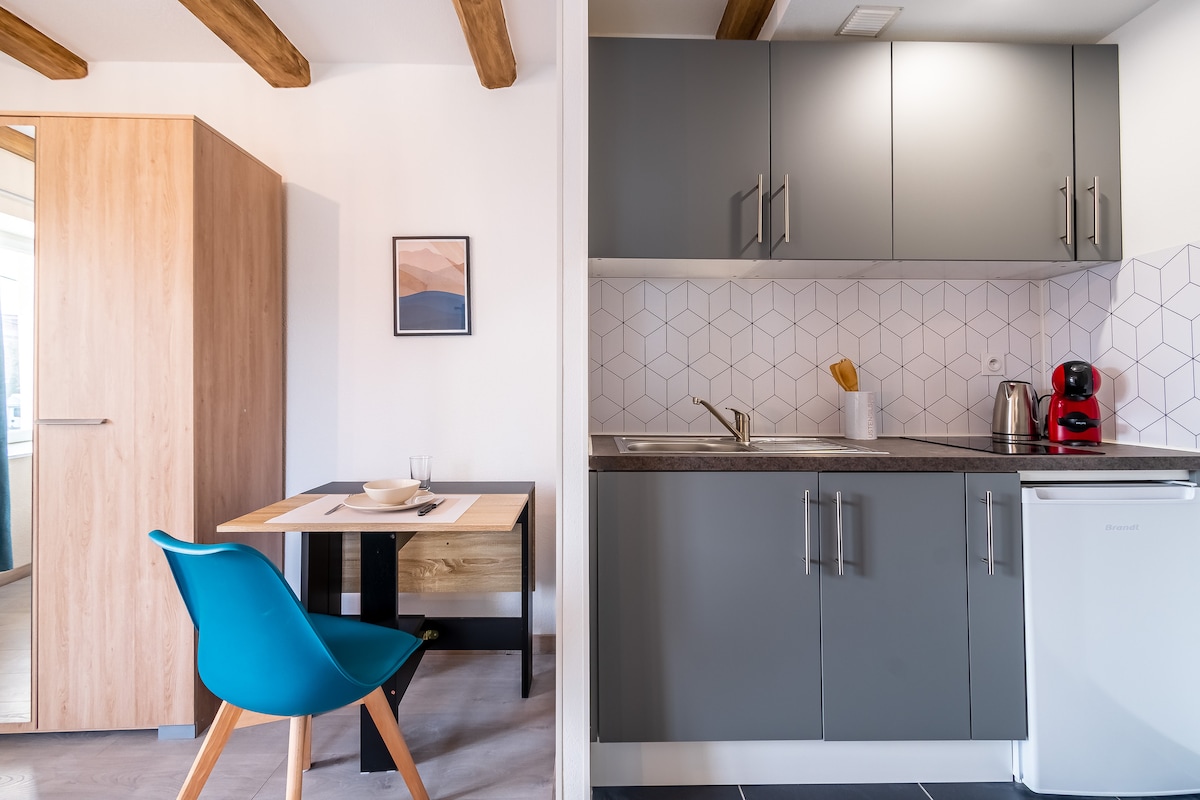 Charming "cocooning" studio on the ground floor of a small condominium. Close to all amenities (supermarket, bakery, butcher) and 10 minutes from two highways. Kick back and relax in this calm, stylish space Private Wi-Fi and small office allowing you to carry out your professional stays. Possibility of adding an extra bed to separate the beds or third traveler for a short stay 20 minutes from the Christmas markets of Montbéliard