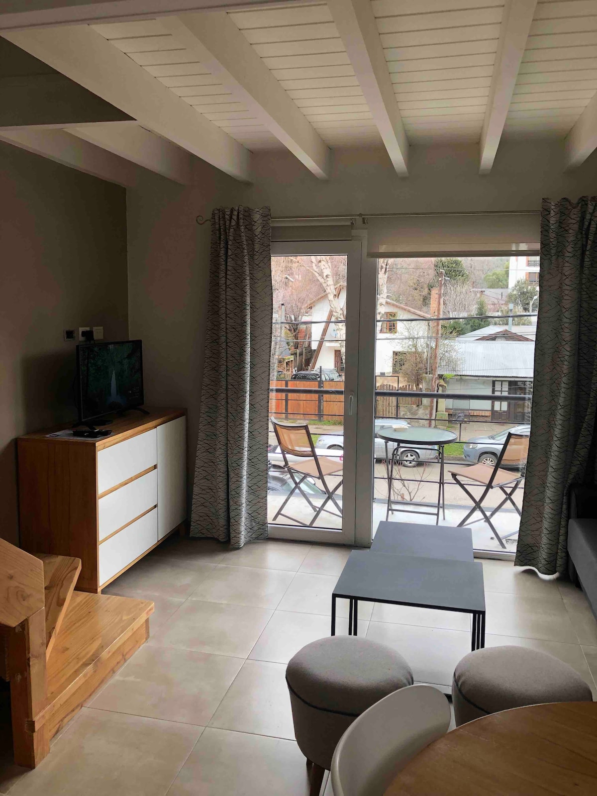 Beautiful downtown apartment. Private open garage 1 block away. Equipped for 3 people. It has a very bright room with mountain views and an en-suite bathroom. A living room with a bed, toilet, kitchen and a large balcony to enjoy the view. The bedroom and living room have blackout curtains. There is a gym for common use, a living room with TV, pool, ping pong and laundry room. The location is excellent and a few blocks from Lake Lacar. The construction is modern and warm.