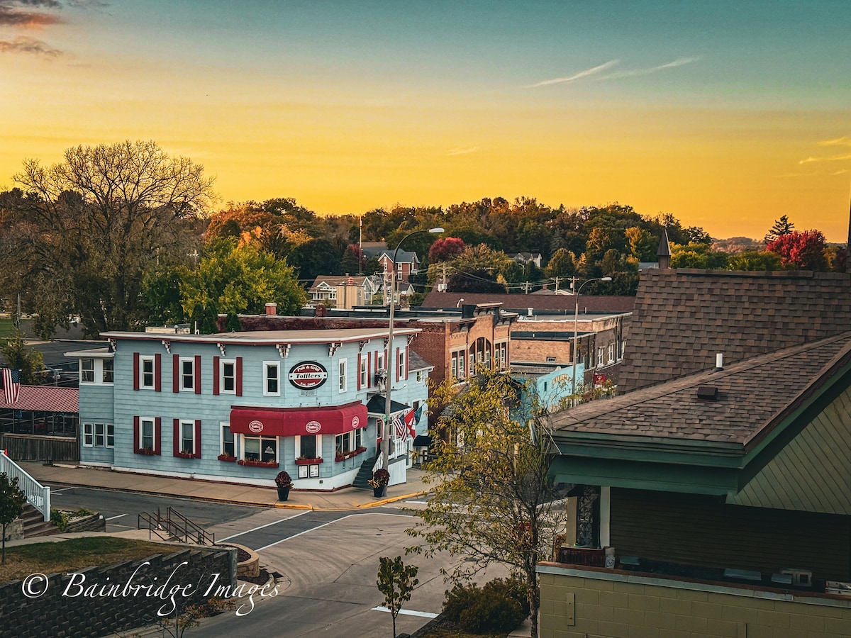 Loft 3 is 40 steps (2 flights of stairs) above the Monroe Square. It's a climb, but the view is totally worth it! Newly remodeled in 2021, and reminiscent of the 1859 character of the building, this space is cute, cozy, and truly one of a kind. Literally a couple steps away from your entryway is Sunrise Donut Cafe, featuring customized donuts and a full menu of excellent coffee items. From there, explore the rest of the Square for food, drinks, and shopping in a quaint Main Street atmosphere.