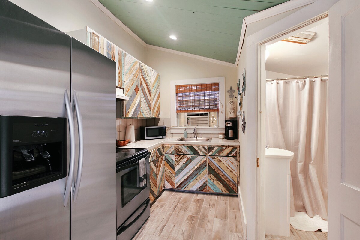 Enjoy morning coffee on the leafy garden patio of this vibrant, Creole-style cottage nestled on a shady corner lot. Prep a meal within the funky-modern confines of the kitchen or wander the colorful interiors until you find a sunny spot on the couch. If you prefer to sleep in while on vacation, feel free to close all the wooden shutters to form a comfortable, dark cocoon in the bedroom and pretend like the rest of the world has stopped while you relax. When you are ready to get out and about, venture outside to explore the unique architecture of the Bywater and visit local dives and hangouts! This guest house is a creole-style cottage adjacent to a traditional shotgun (occupied by the host) on a shady corner lot in the Bywater Historic District. Originally built in the 1800s, renovated in 2007, and completely refreshed in 2017, guests will enjoy full, private access to this 600+ square foot, 1 bedroom, 1 bath cottage with a fully appointed kitchen. There is a queen bed in the bedroom plus a West Elm modular couch in the living room that comfortably sleeps one adult. Extra linens and pillows are provided. Flat-screen TV with DirecTV and DVD player. Washer/dryer in unit with supplies. Freshly-squeezed grapefruit and satsuma juice from trees in the courtyard, when in season (October - February)! Guests may feel welcome to sit in the courtyard, with a private patio just outside the living room door. We live on-site, and the door to our home is just across the courtyard from the living room or at the deck by your entry door. Should you need anything, we’re happy to be at your service. Otherwise, we'll leave you to the quiet enjoyment of the space and to enjoy your travels. The guest house is situated in the Bywater Historic District, a Creole neighborhood mostly known for its brightly colored architecture and creative community members. The neighborhood boasts easy access to dining and entertainment, and a number of hotspots are nearby including one of the city’s best brunches, a nano-brewery, and a wine bar with live courtyard jazz multiple times a day! The Crescent Park trail along the river is two blocks away and is a nice gateway to the French Quarter. The Crescent Park trail along the Mississippi Riverfront is two blocks from the house and offers easy bike/pedestrian/wheelchair access to the French Market (about 1.5 miles) along with the rest of the French Quarter beyond (Jackson Square is about 2 miles from the house). Multiple bus routes are within 2-4 blocks of the house, including Bus Route 5 two blocks away that takes you to the Quarter. The Rampart-St. Claude Streetcar Route is approximately 1.6 miles away at the intersection of St. Claude and Elysian Fields. Several local businesses offer scooter and bike rentals within a couple miles of the house, and a bike share station (Blue Bikes NOLA) is located around the corner. Uber/Lyft/rideshares are readily available, typically in 5 minutes or less at most times of day, and cost around $7-$12 to the French Quarter/CBD (or Central Business District as we in New Orleans call our downtown), depending upon traffic, time of day, exact dropoff location, etc. If you are driving your own vehicle, apps like "Spothero" will help you find and compare options for private or paid parking lots and spaces at your destination. On-street parking is typically pretty easy to find and no permit is required/no time restrictions exist. J&J's Sports Bar is across the street. While it can be great for watching a game close-by or for a night cap before you hit the sack, depending upon the day, it can also create conversation noise into the wee hours. A white noise machine is provided in the bedroom, in case of sensitive sleepers. City of New Orleans Short-Term License Number/Type/Expiration: 17STR-16097/Accessory STR/16 August 2018