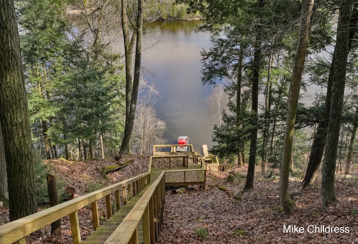Enjoy this beautiful lake cabin on Croton Pond and the one-of-a-kind treehouse. This pet-friendly 2-bedroom, 1-bath cabin has great views of the Muskegon River Valley and all the amenities necessary for an incredible stay. It includes a small private beach and dock for a boat on a large all-sports lake. Lake is accessible via 185 steps. The area is known for incredible fishing, boating, hiking, and mountain biking. We are approximately 2 miles from the Dragon Trail mountain biking.