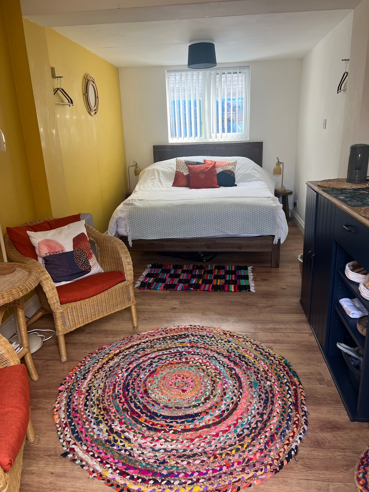 Cosy and functional self contained brand new build studio at end of large garden with sea views. Just a 5-10 minute walk from the nearby beach. Excellent travel links (rail and bus), beautiful cycle routes immediately accessible. This is a purpose built space with very comfy king size bed, private bathroom with shower, toilet and basin. Kitchenette area with sink, fridge, 2 ring hob and microwave with oven and grill. Electric heating, freeview TV. On road parking available.