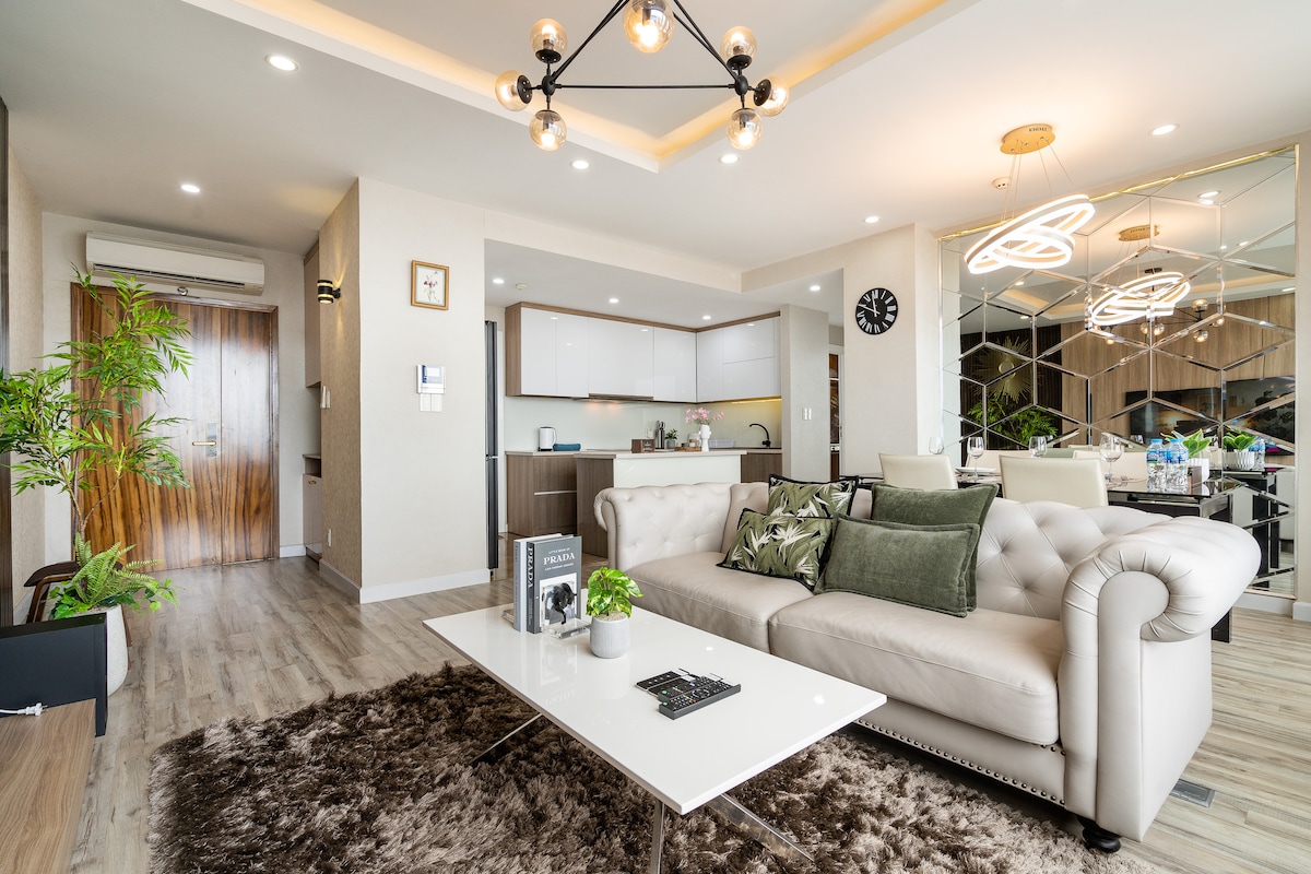 A stylish & comfortable apartment with balcony 85m2 at Hung Phuc Happy Residence located in the heart of district 7, Phu My Hung, with just a short walk to stores, mall, restaurants, and conveniences. Nearest bus stop in front. Highly educated and quite neighbors that surrounded by green parks and beautiful villas. Decorated in modern Japandi x Wabi sabi style with a focus on natural materials & clean lines. A great getaway or even staycation for those who want to experience new things.