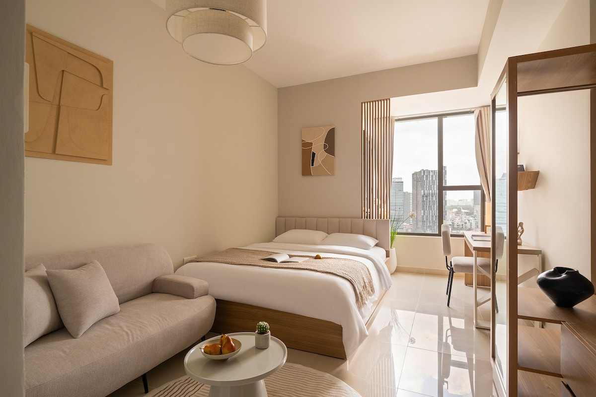 Discover a tranquil Japanese-style apartment in District 7, just 1 km from Phu My Hung. This 55m², one-bedroom space blends modern minimalism, offering river views and a tranquil ambiance. Enjoy a fully equipped kitchen, smart TV, high-speed Wi-Fi, and comfortable bedding, including an extra bed. The building features a rooftop infinity pool, sauna, gym, and on-site conveniences like cafés, convenience stores, ATMs, and children’s play area. Perfect for a relaxing and convenient stay in Saigon.