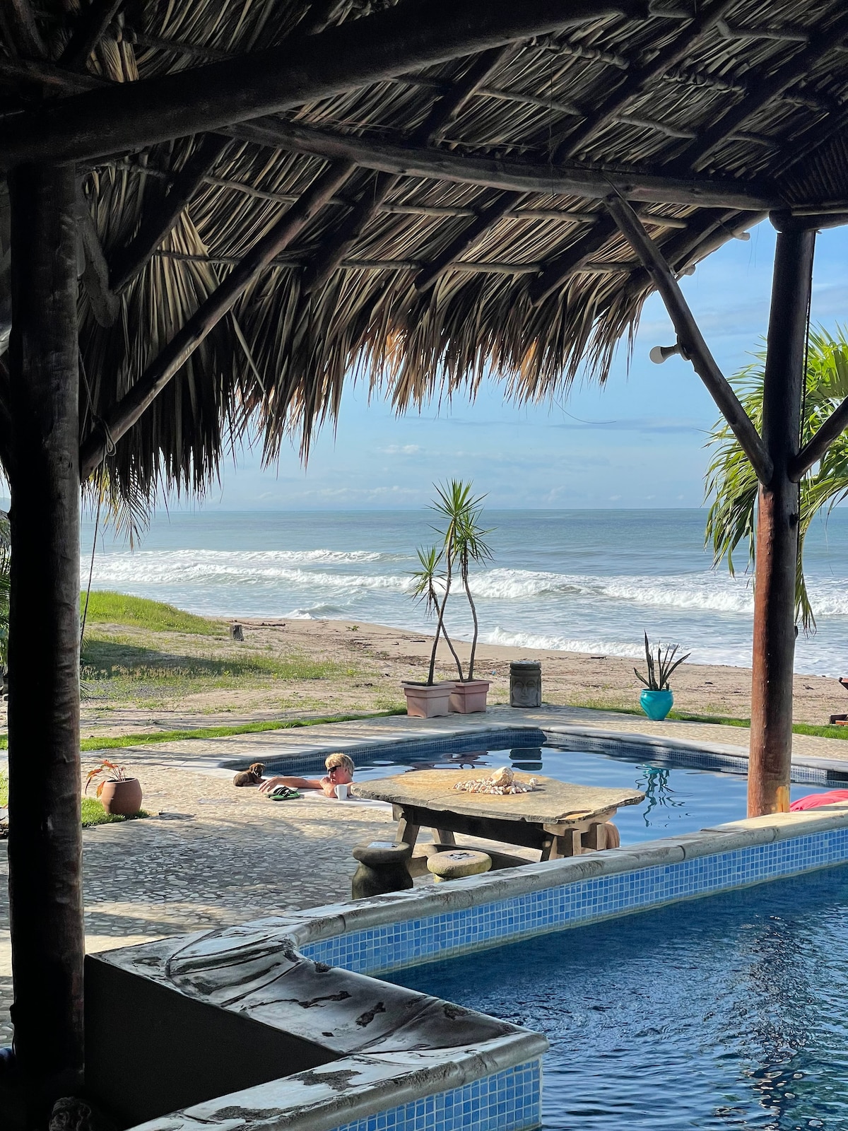 This listing is for one private suite with two beds in this unique surf camp with private bath and Air Conditioning. Includes lodging, housekeeping, two pools, a full kitchen, and bar. A $100 meal package is available and highly recommended, with all meals prepared daily. The open-air 40-foot thatch palapa offers a relaxed lounge and dining space—perfect for morning coffee or evening drinks. We can also recommend surf guides, tours, fishing trips, golf and much more in the area.