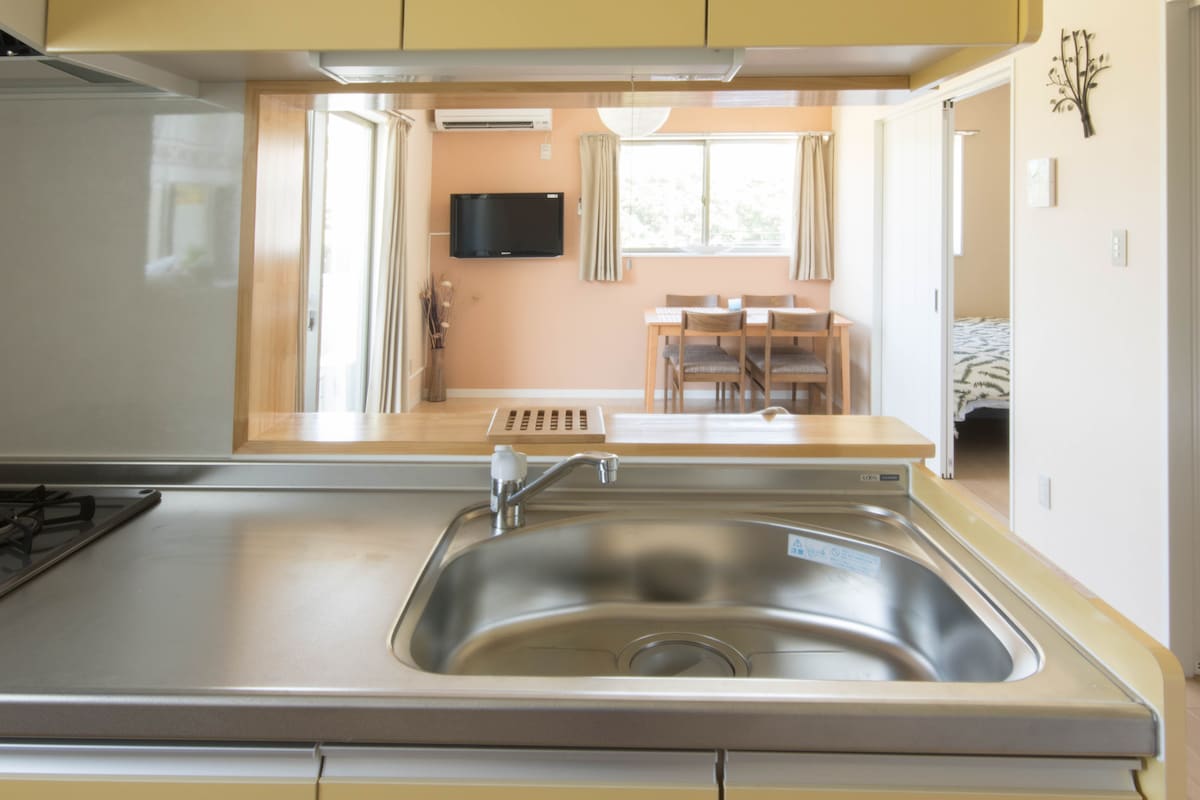 We are registered with the Japan Health Ministry.: 宮保衛指令第104号 New, modern two bedroom apartment good for a family or up to four adults. Three minute walk (one street back) from Aoshima Beach, close to golf course. Quiet location. Wifi, access to chromecast, full kitchen, parking. 8 minute walk from nearest station. Cooking Utensils, Gas Range, Microwave Oven. Space to store your surfing/sports equipment. If you are coming for work, please let us know and we can supply you with an office chair