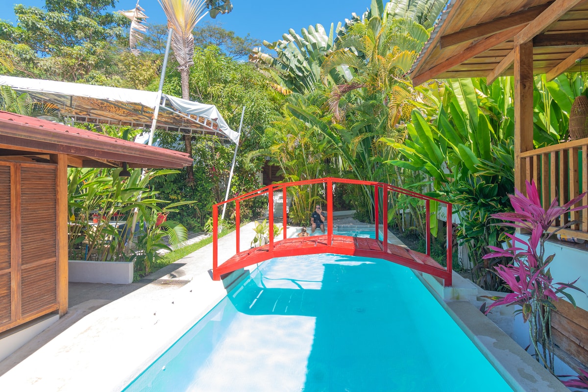 Treehouse designed for two people, perfect for couples or a peaceful getaway. Surrounded by nature and wildlife, with stunning ocean and mountain views, just minutes from downtown Tamarindo. Relax in the tiny pool under the trees, unwind in the hammocks, enjoy a coffee in the tropical garden, and watch sunsets from the panoramic terrace. Comfort includes AC, rain shower with hot water, fully equipped kitchen, BBQ, WiFi, private parking & security cameras.🌿