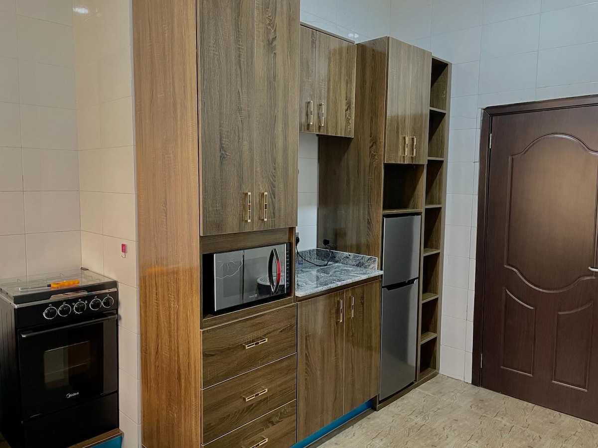 -24/7 Electricity- (AEDC/INVERTER /GEN) -Fully equipped Kitchenette. -Furnished Living Room -Furnished Bedroom - 1-Air-Conditioner -Proximity to supermarkets, Schools, and Restaurants. -Clean and Fresh Bedding and Towels -Excellent Customer Service and Support. -Regular Housekeeping -Serene, secure, and Beautiful Neighborhood. 43'' Smart TV (DSTV, Netflix) Fibre Optic Wi-Fi King-Size Bed