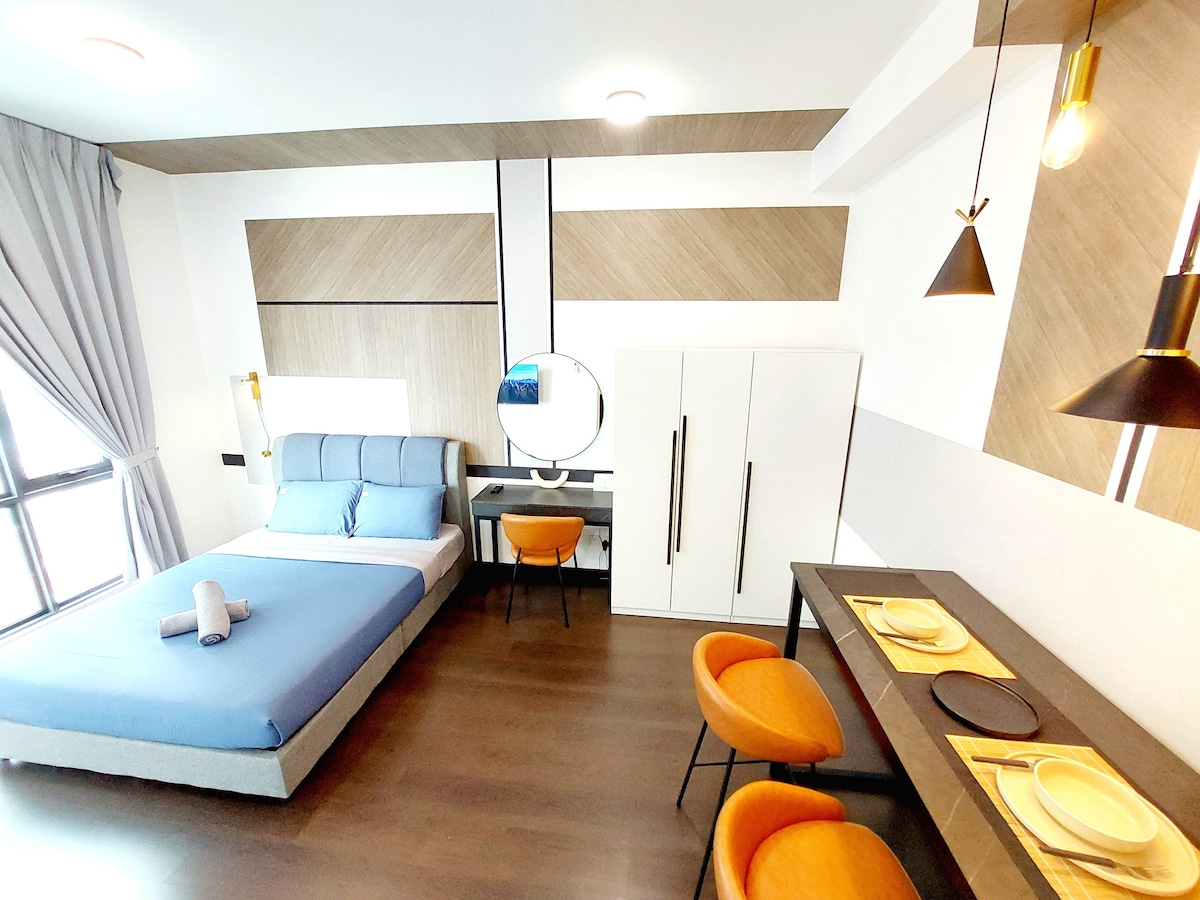 (1+1 BR & 1 bathroom) Contemporary modern and cozy condo in the heart of JB city centre. Suitable for 4pax family, friends and business group. **5mins to CIQ, City Square, KSL, Pelangi, and Larkin **8mins to Mid Valley Southkey, Larkin Sentral and Sentosa **15 mins drive to Paradigm mall, Sutera, Skudai and Mount Austin ✔ 4K SmartTV ✔ High Speed Wi-Fi, working tables with extension plug ✔ Washer ✔ Airconds in every rooms. ✔ Atari console, Mahjong, and Board games. ✔ FREE parking for 1 car