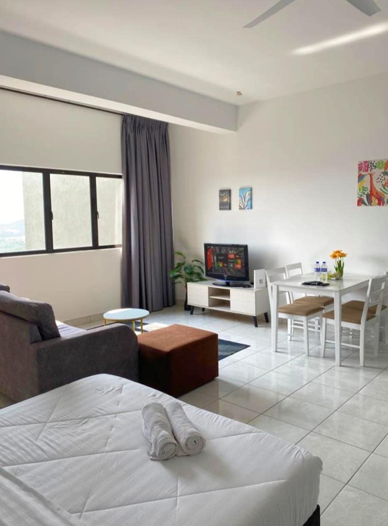 Relax in this cozy, fully equipped, stylish studio in a new premier apartment block near KLIA. Next to Mesamall with groceries, eateries, cinema & more. Enjoy a king bed, 200Mbps WiFi, 43” Google TV, kitchenette, dining & work tables—perfect for rest or remote work. Relax at the infinity pool with mountain views, stay fit in the full gym, or unwind at the rooftop area with stunning views. Ideal for short or long stays. Whether flying in or working remotely, this space feels like home