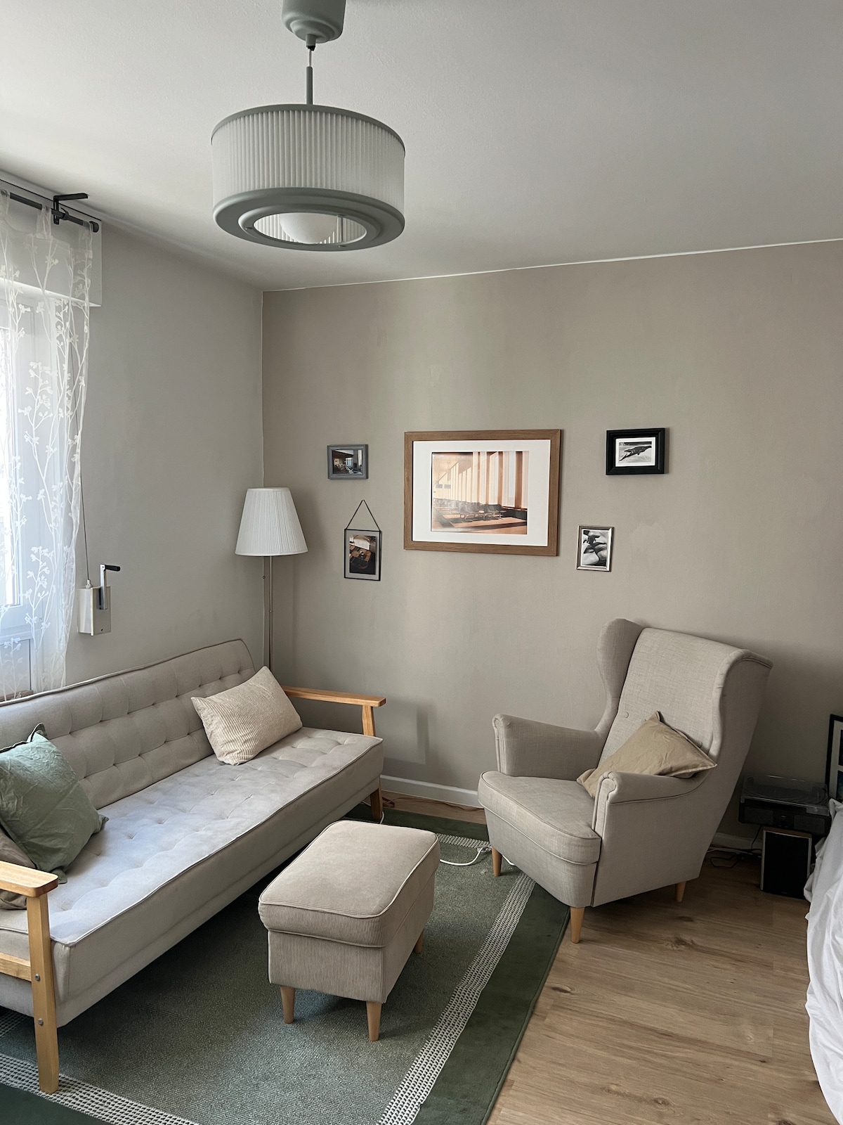 Our accommodation is a beautiful 1-room apartment with a floor-level shower room. The apartment was completely refurbished and renovated in January/February 2020. It is located in the basement of our detached house and is accessible via our garden with a private entrance. It has a cozy box-spring bed, a seating/work option, Wi-Fi, fridge, microwave, tea maker, coffee maker and a seat in front of the entrance.