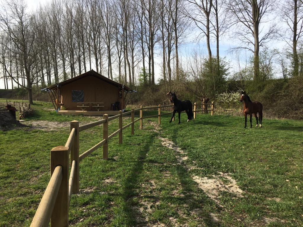 This "solo safari tent" is located in a sheltered place in the meadows surrounded by knot willows. At the bottom of an unpaved walking dike with a pond next to it. The horses and sheep come every now and then to see what you are doing, but that will not disturb your privacy. Luxury "camping" with the convenience of (green) electricity, hot and cold water, outdoor shower, good mattresses, campfire, small but complete kitchenette. Dogs (max 2) are welcome but in consultation. Please contact us before booking.