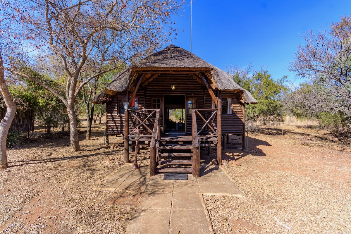 Country living with all the amenities you will enjoy in the city. A secure thatch chalet build from rock. Situated on a 21ha bush veld farm. Lots of bird life Impala, Blesbok and giraffe roaming around. 1 Bedroom with queen size bed and bathroom on suite. Open plan living area with fully equipped kitchen dining room and lounge with queen size double sleeper couch and Dstv. Cool veranda amongst trees. Beautiful terraced garden with (boma) barbecue area. Under cover parking. Pool recently added.