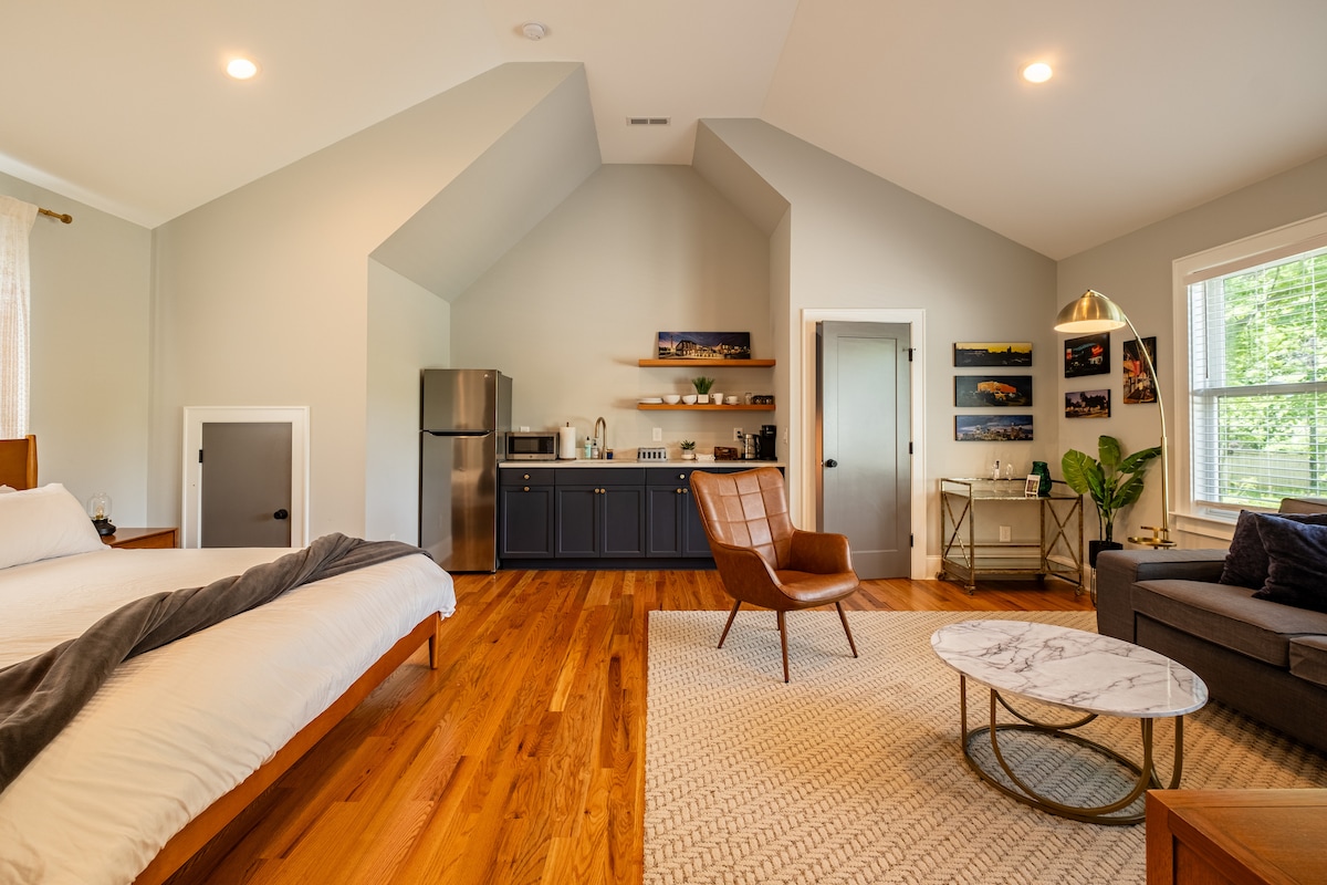 Escape to our backyard haven in vibrant Villa Heights, just 3 miles from Uptown Charlotte & walkable to coffee, drinks & more. This stylish guesthouse blends modern comfort with urban charm. The well-designed space features a comfortable bedroom, contemporary bathroom, cozy living room, & kitchenette. Vaulted ceilings & ample windows create an open, airy feel with abundant natural light. Immerse yourself in the inviting ambiance & experience the best of the Queen City from this chic retreat.