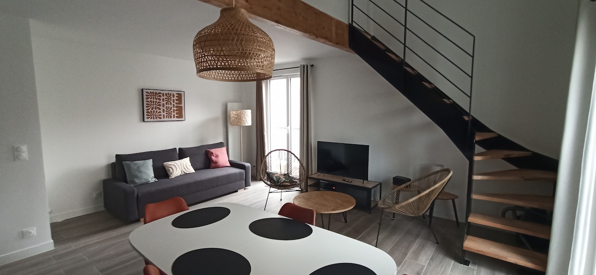 Charming 50 m2 duplex in the center of Nogent, on the 2nd floor of a very quiet residence, located 15 minutes walk from the RER A (station 15 minutes from Châtelet-les Halles and 45 minutes from Disneyland Park), 15 minutes from Bois de Vincennes and the banks of Marne and 2 minutes from the market. This duplex has just been refurbished, it is dual-aspect and bright and can accommodate up to 5 guests. It consists of a large living room overlooking a fully equipped open kitchen and two bedrooms upstairs.