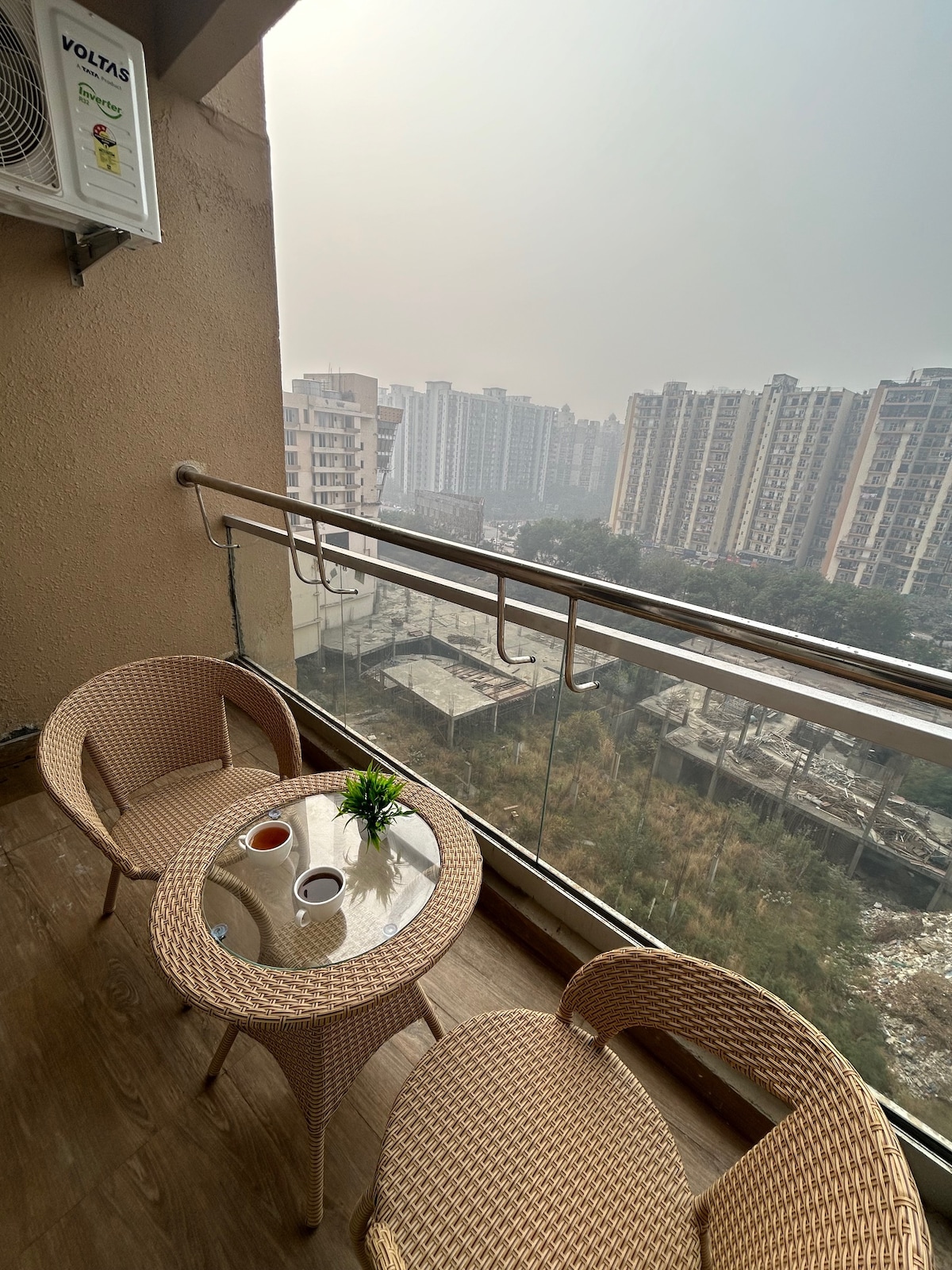 Tucked high above the quieter edges of Greater Noida, Amberlyn by Saanjh Savera Stays is a thoughtfully designed studio apartment, perfect for slow mornings and stunning sunrise views. Whether you're a remote worker, a couple on a city getaway, or a solo traveler looking to recharge, this space offers comfort, calm, and a soft sense of escape. Set on the 14th floor, it offers stunning natural light and a calming view of the cityscape below.