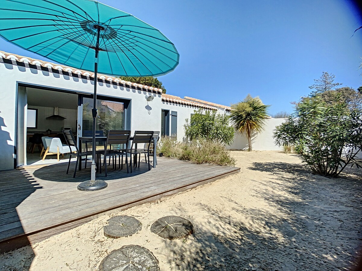 Typical 50 m2 detached house Large living room with equipped kitchenette (microwave and Nespresso machine) Beautiful bedroom with beautiful bathroom. Very comfortable 160 cm bed. Private garden (400 m2) with terrace and deckchairs (partly open to the garden of the owner's house: very private) you will be at home! 3-minute walk to the large beach of Luzéronde 5 min by bike from the port of Herbaudière and 20 min by bike path from the center of Noirmoutier