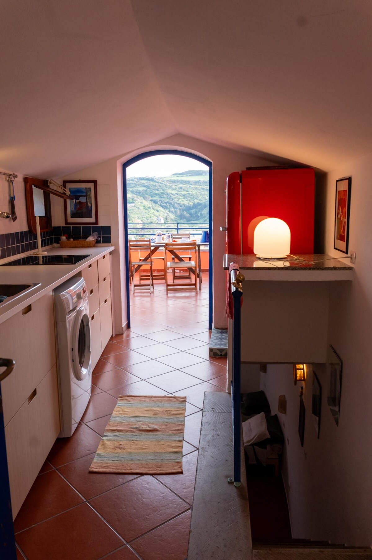 A small loft located in central Sardinia. Approximately 60 square meters, with a large window overlooking the valley below. The spaces are dedicated to the comfortable use of an open living space communicating with a creative space of Sardinian craftsmanship and an architecture studio. The B&B is designed to accommodate people who, if they wish, can learn the art of manual weaving in the adjacent workshop, which is clearly visible from the open space.