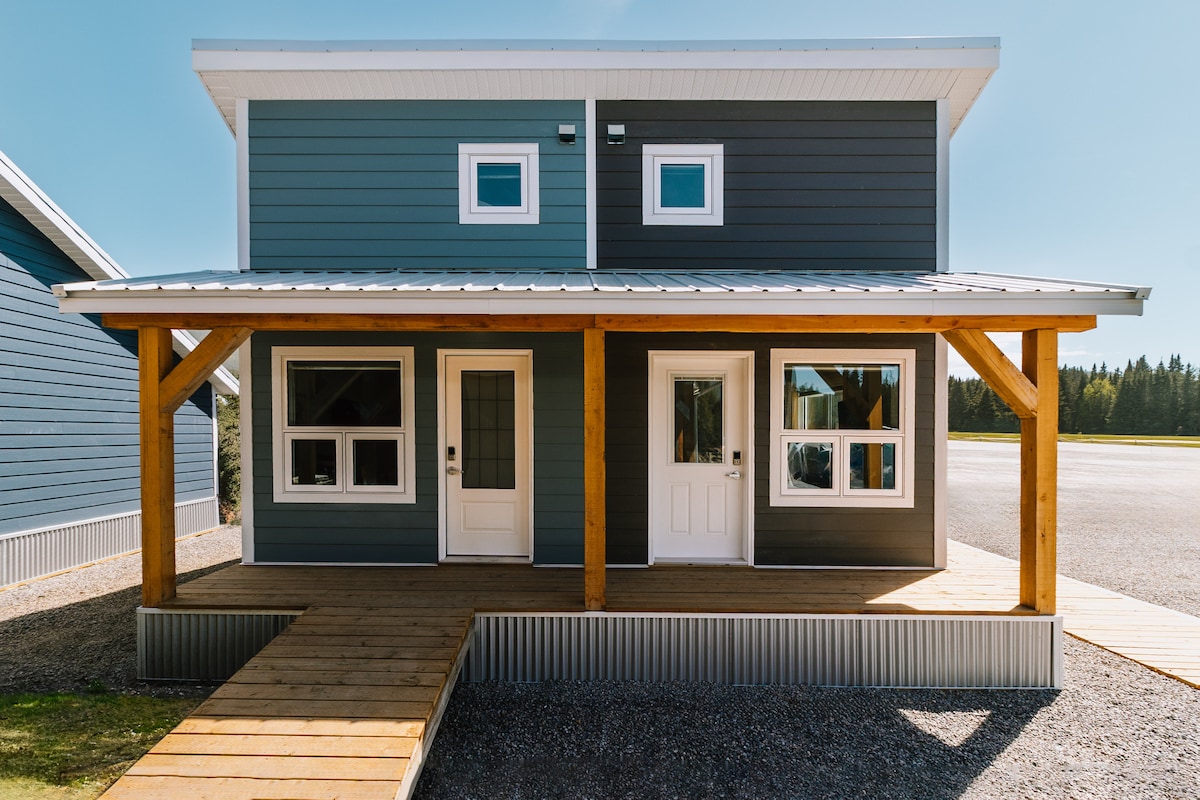 Modern tiny home in the heart of Nordegg, AB—nestled in the Rockies on a golf course with mountain views. Sleeps 4 (1 bedroom + loft), full bath with heated floors, and a well-equipped kitchen (NO OVEN). Enjoy the front porch for sunrises, sunsets, and stargazing. Includes Smart TV, games, books, Bluetooth speaker. Pet-friendly and walkable to town. Shared fire pit area with BBQ and roasting sticks—perfect for cozy mountain nights.