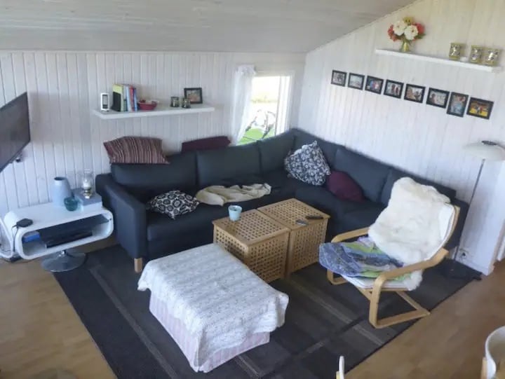 Fantastisk beliggende hus 90 meter fra vandkanten! Privatunterkunft! Mageløs udsigt og masser af indvendig hygge. Alle moderne faciliteter, med brændeovn og klimaanlæg. 60 m2 fordelt på 2 etager. Øverst en stue med åbent køkken. Nederst et soveværelse med 180x200 seng, og åbent kammer med sovesofa 120x200. Dette er et transitrum. Badeværelse. Trådløst internet, samt TV. Alt i køkkenudstyr og opvaskemaskine. 2 terrasser, Der er en 2-kajak til rådighed. Cykler er også til rådighed.