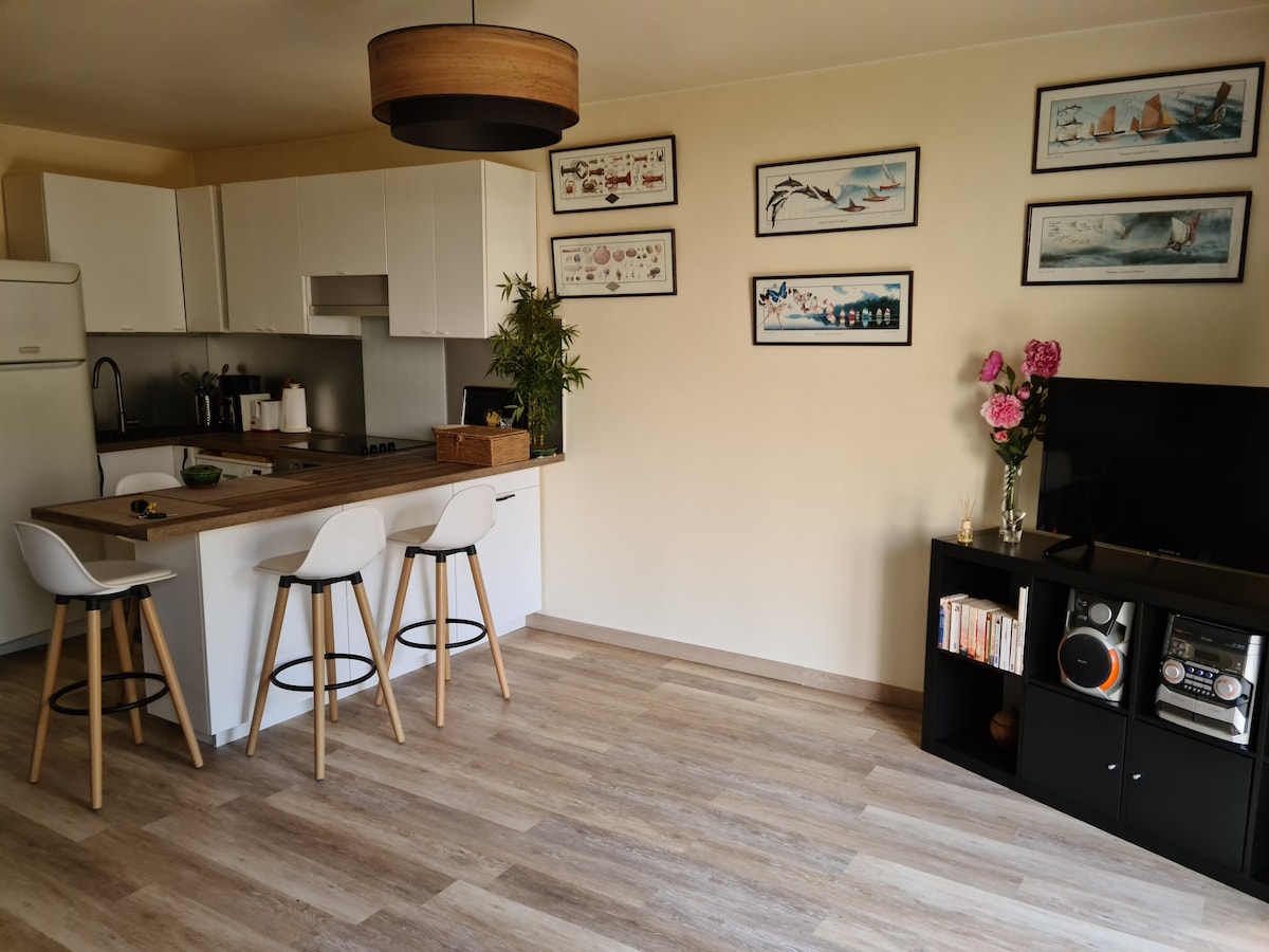 Enjoy our studio with south-facing balcony and Balnéo bathtub at the Marina. It is equipped with a real 160 x 200 bed with linen sheets, Wi-Fi, connected TV, equipped kitchen with dishwasher, organic coffee machine with grinder, organic tea and soda stream, 1 free bottle of fresh local cider, Wi-Fi. Relaxation guaranteed in the bathroom equipped with a spa bath for one person. The toilet is separate. Free parking is available at the foot of the building.