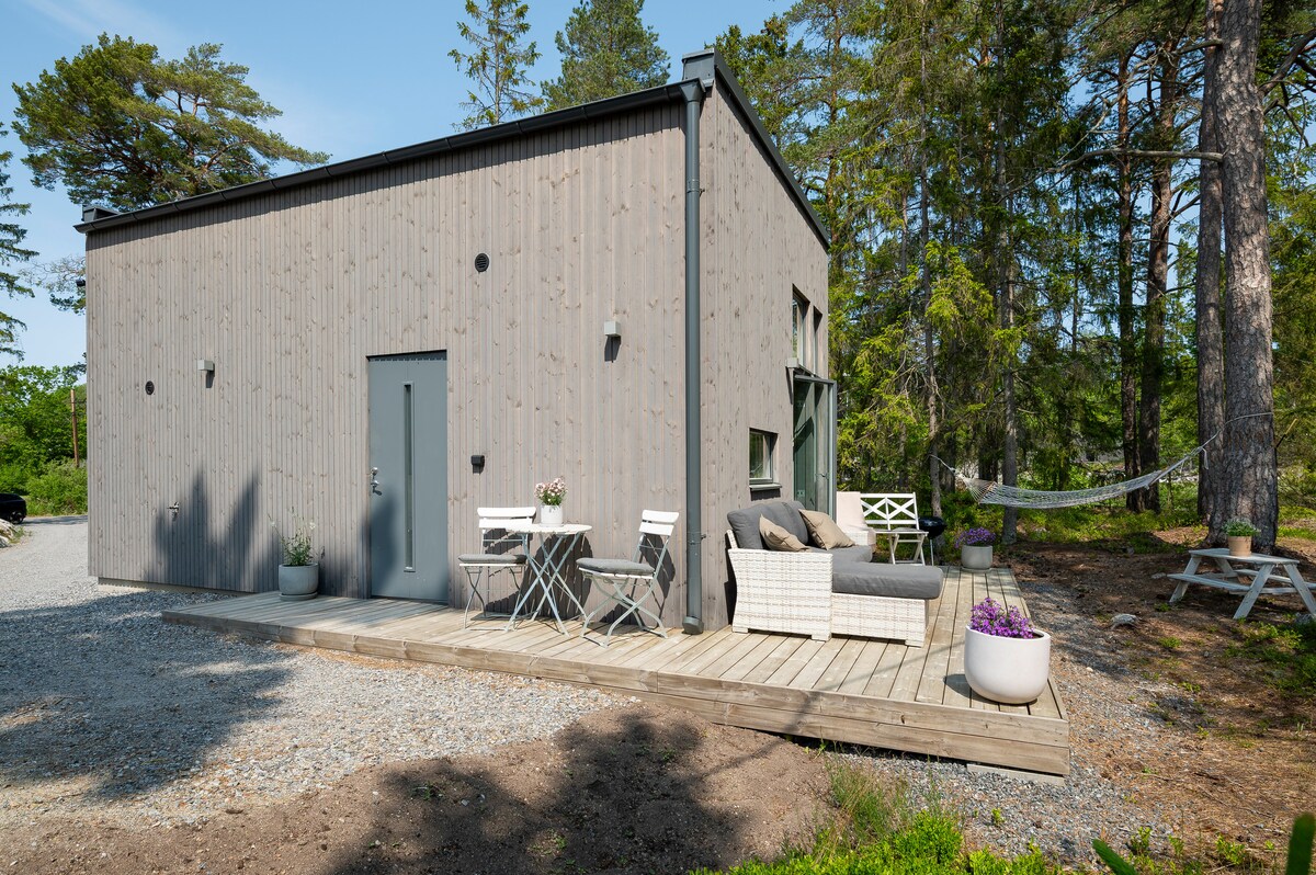 Located between Stockholm city and its beautiful archipelago. Right by the sea. Close to local shops and restaurants. Cottage built 2016. Comfy King size doublebed, two beds on a cozy loft. Wifi. De luxe bathroom w shower, WC, zink and Heated floor. Large flat screen cable-TV. Fridge, Water boiler, Coffee Press, Cutlery, Glasses, Mugs etc. Please note: NO FULL Kitchen.. but a Chef Plus Microw/oven. Also, in season, an outdoor grill, seating chairs & a table.